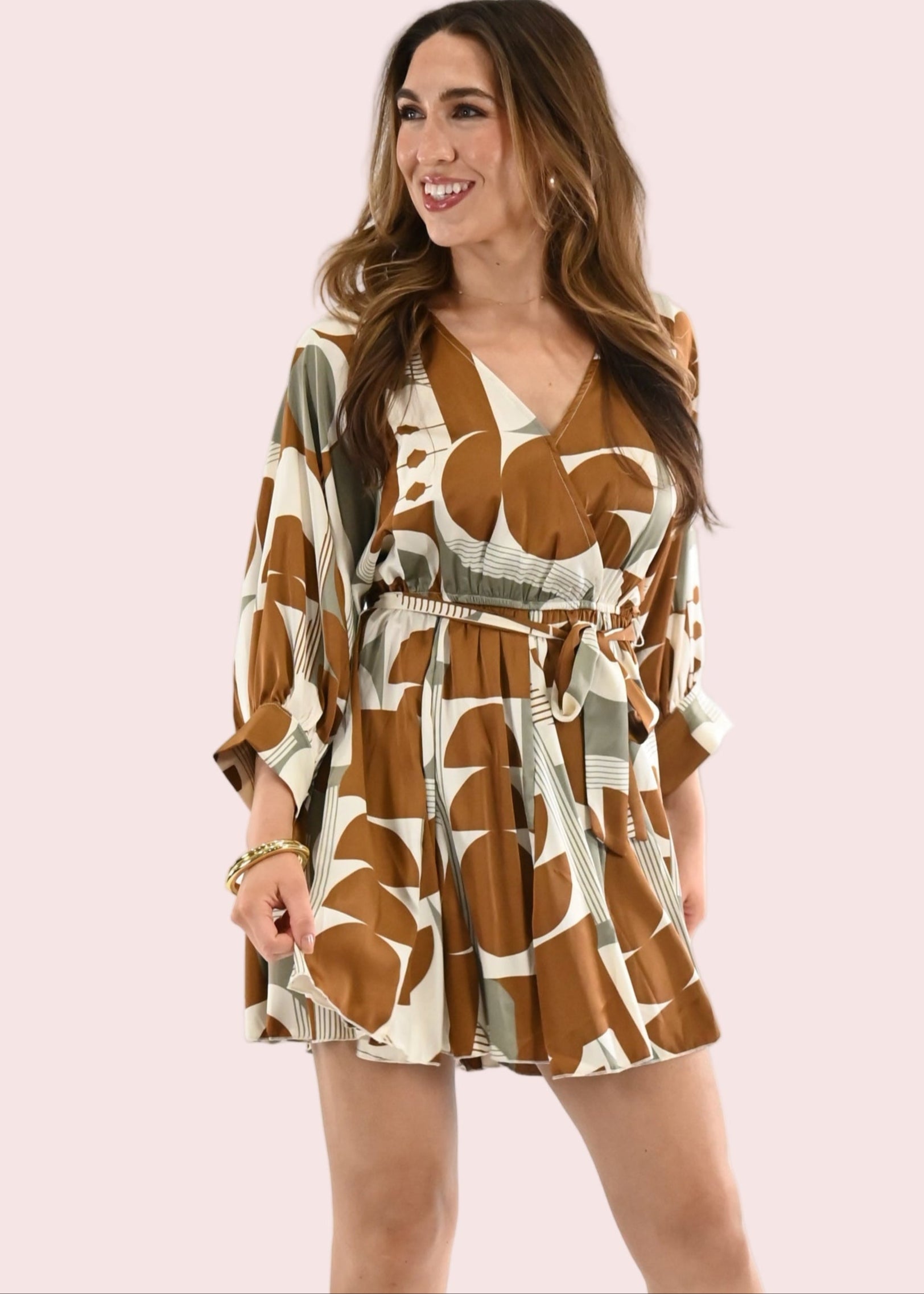 Experience elegance with the FIFTH AVENUE STROLL GEOMETRIC PATTERN MINI DRESS. This mini dress features 3/4 dolman sleeves and an elastic waist with a belt for a flattering fit. It boasts a V-neck with a convenient snap closure, a flared skirt, and a striking geometric print on smooth, silky fabric—perfect for turning heads wherever you go.
