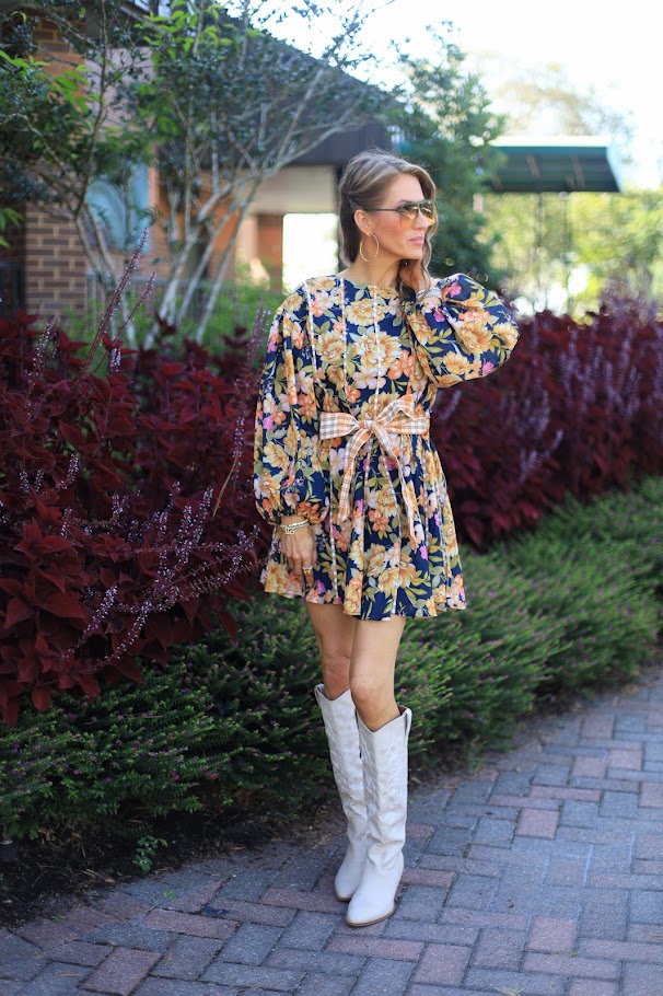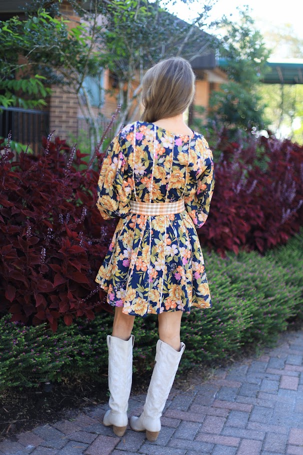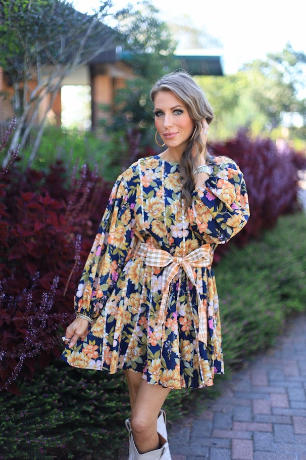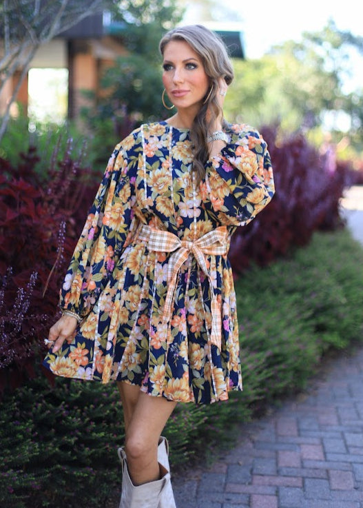 Discover the ALL YOURS HONEY PLAID DETAIL DRESS! Featuring a floral navy base with striking plaid pleat accents, this dress offers a round neckline, long sleeves, a flattering belt, and a flowing full skirt. Perfect for making a stylish statement.