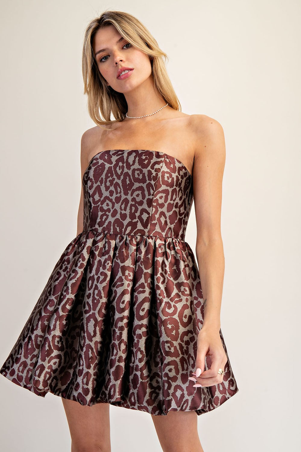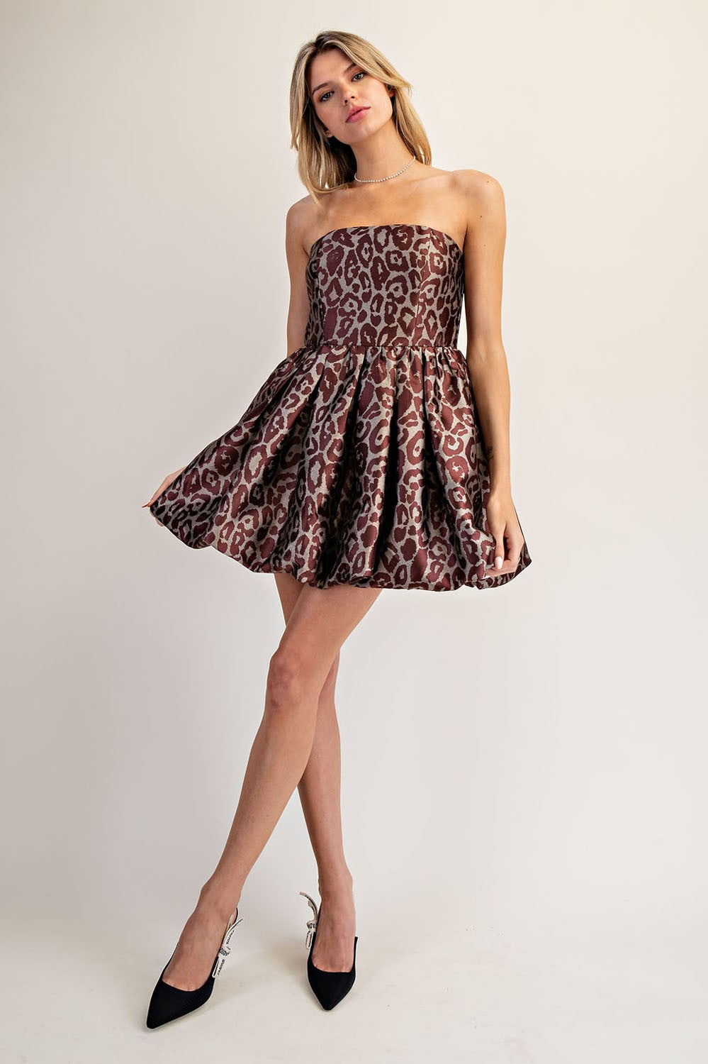 The HER SWEET SIDE STRAPLESS LEOPARD BUBBLE DRESS is a fun, flirty mini dress boasting a fitted strapless bodice and a dramatic bubble skirt. Covered in a shimmering metallic leopard print and equipped with a hidden back zipper, this dress creates a striking, party-perfect look with a touch of wild charm.