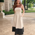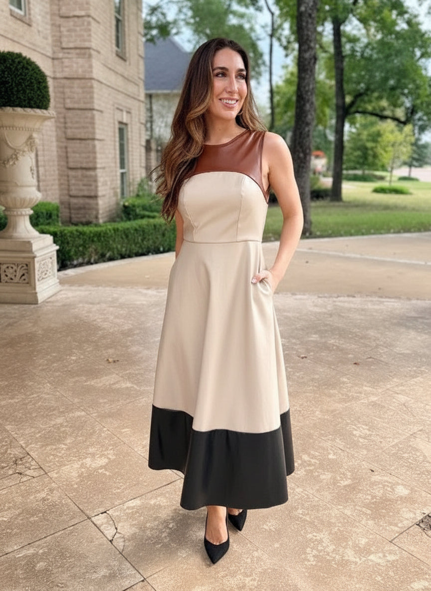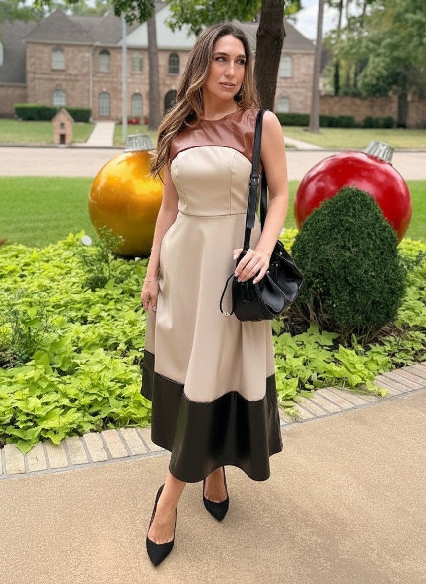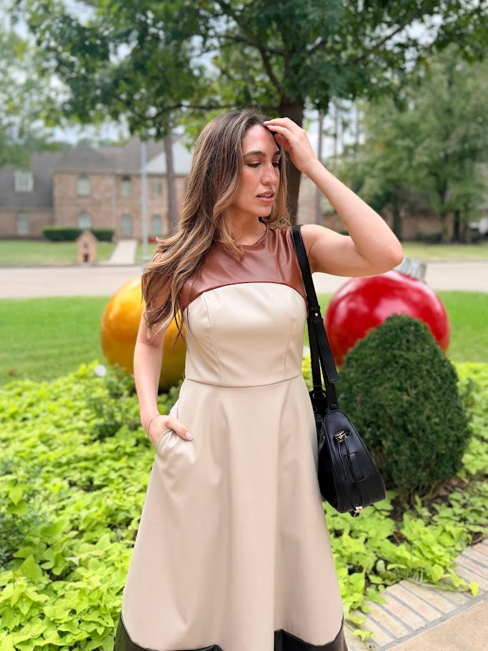 Indulge in effortless style with this stunning CHOCOLATE WITHOUT THE GUILT COLOR BLOCK FAUX LEATHER DRESS. The sleek sleeveless silhouette pairs rich chocolate tones with contrasting hues for a modern, eye-catching look. A convenient back zipper ensures easy dressing while maintaining the dress's polished aesthetic. Perfect for elevating your wardrobe with a piece that feels luxurious without compromise, this dress transitions seamlessly from day to night occasions.