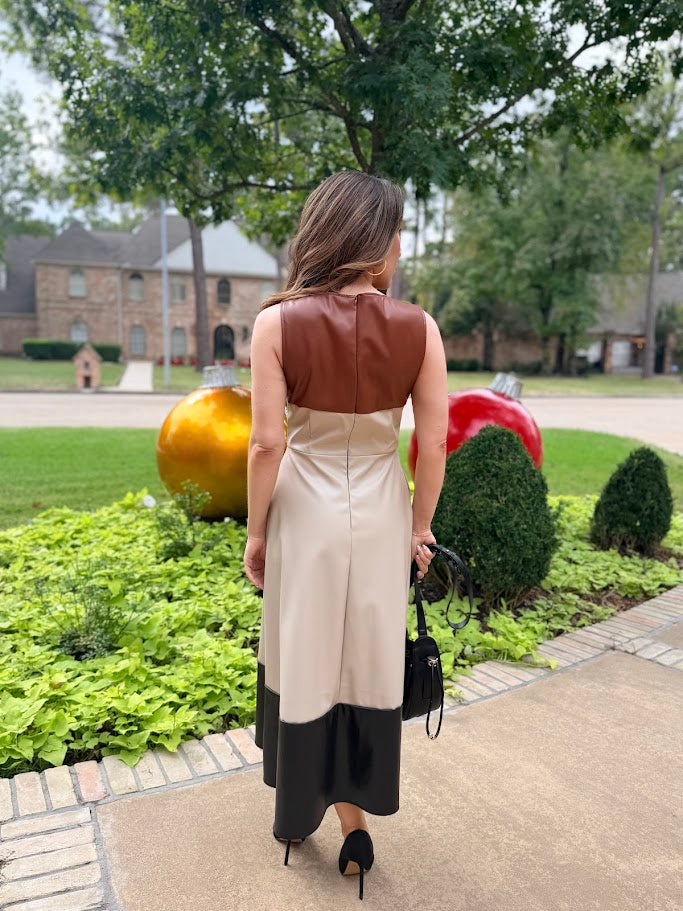 CHOCOLATE WITHOUT THE GUILT COLOR BLOCK FAUX LEATHER DRESS