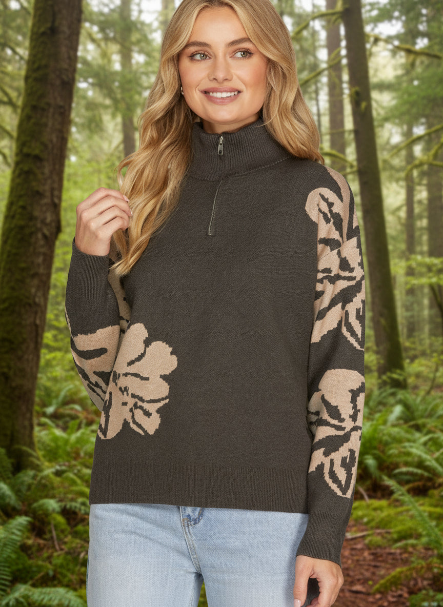 BRISK STROLL QUARTER ZIP FLORAL SWEATER