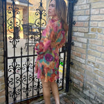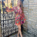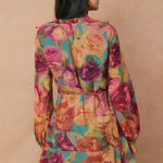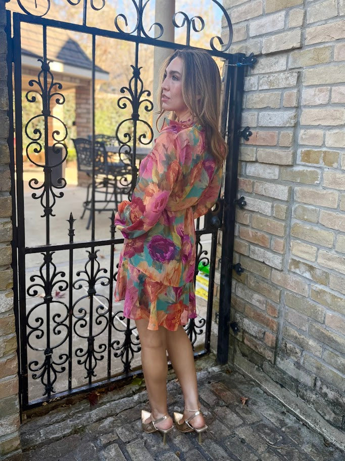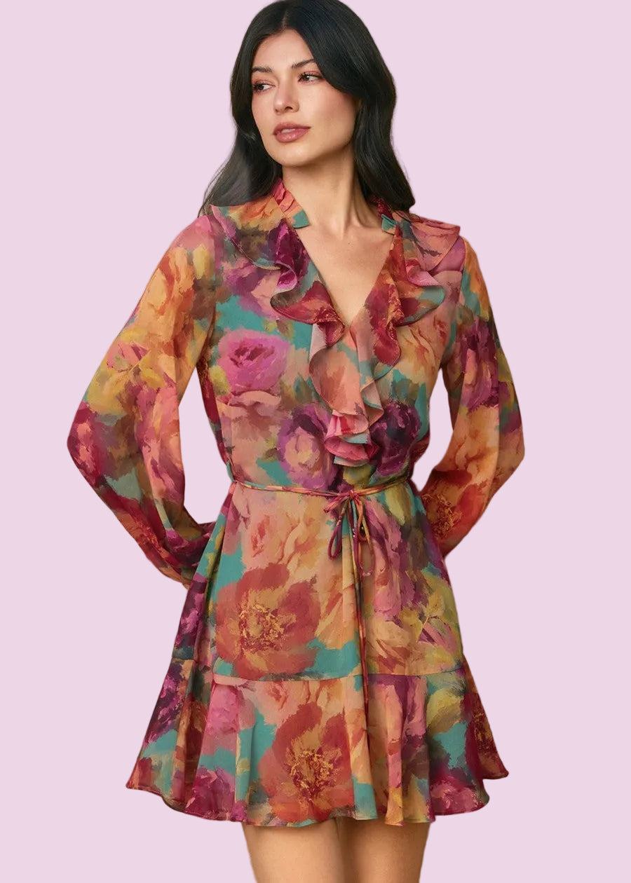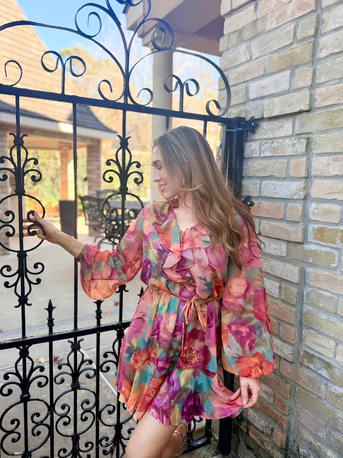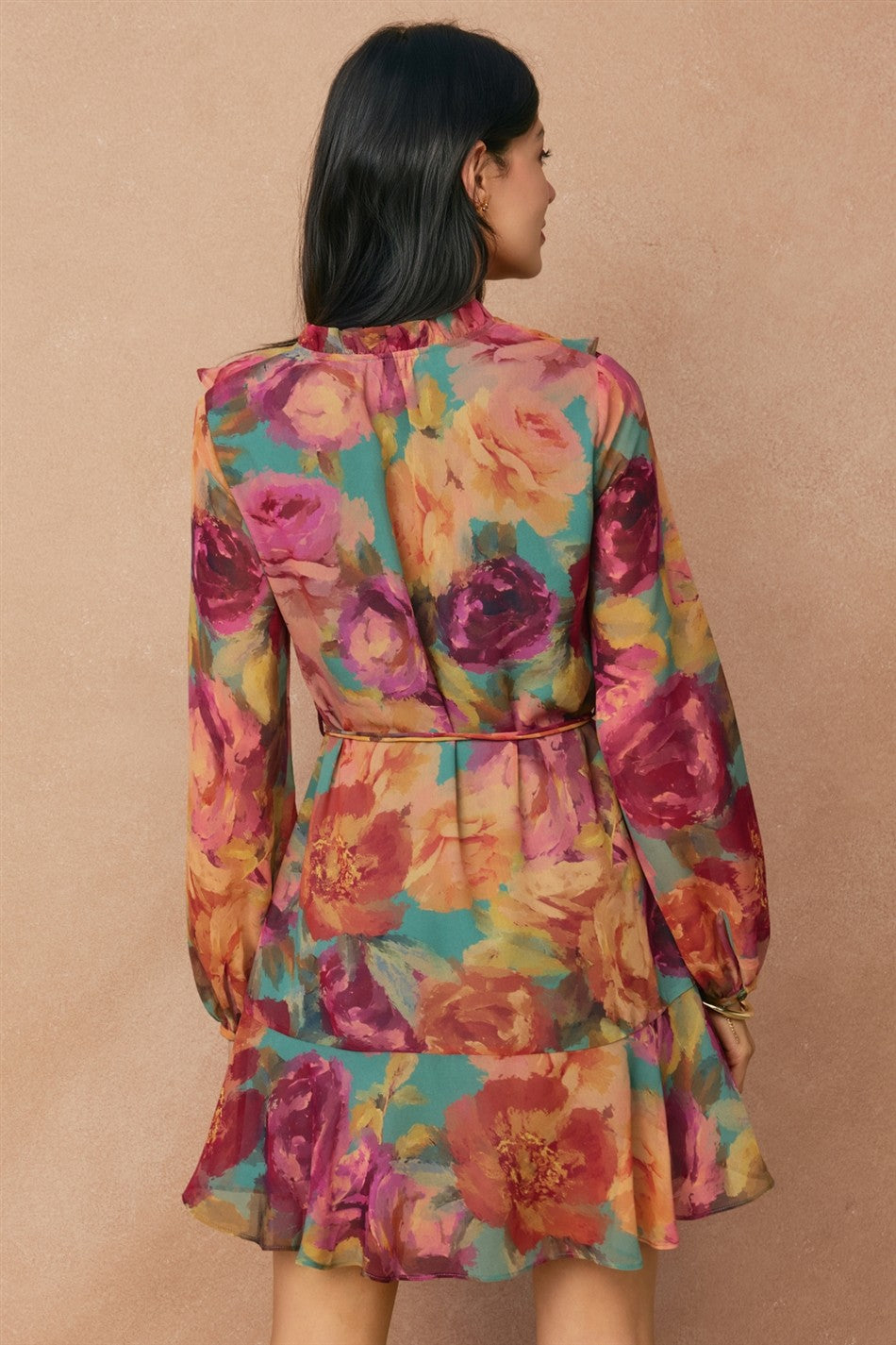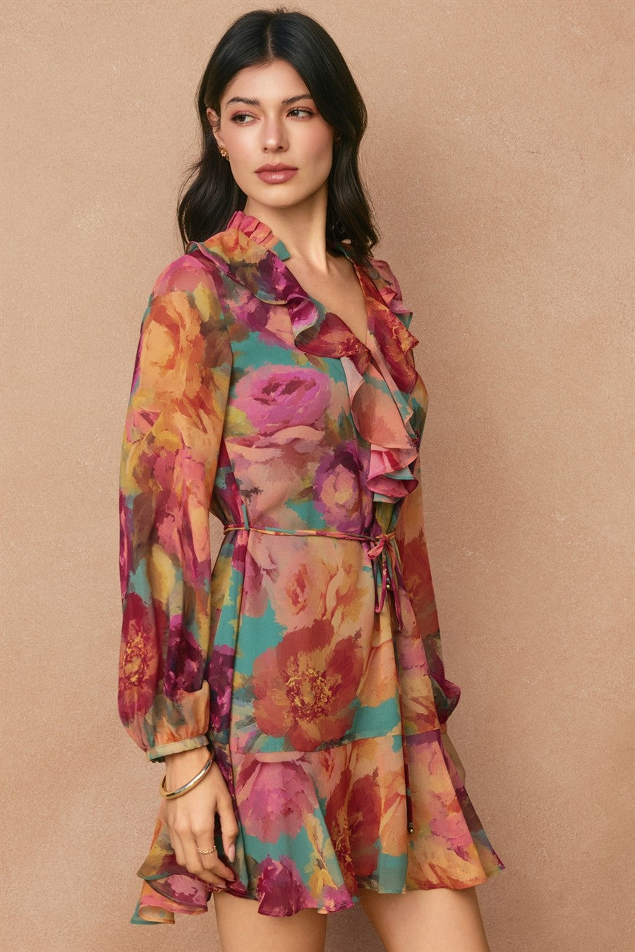 This floral print chiffon WILDFLOWER WHIMSY MINI DRESS features long sleeves and soft ruffle detailing throughout for a romantic, feminine look. Designed with a ruffled surplice neckline and hidden button closure, it also includes ruffle trim at the neck and functional front button closures. The long bishop sleeves are finished with button cuffs, while a double cord waist sash tie creates a flattering, adjustable fit. A ruffled hem adds movement and charm, and the dress is fully lined for comfort and coverage.