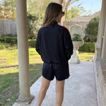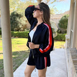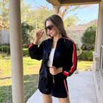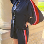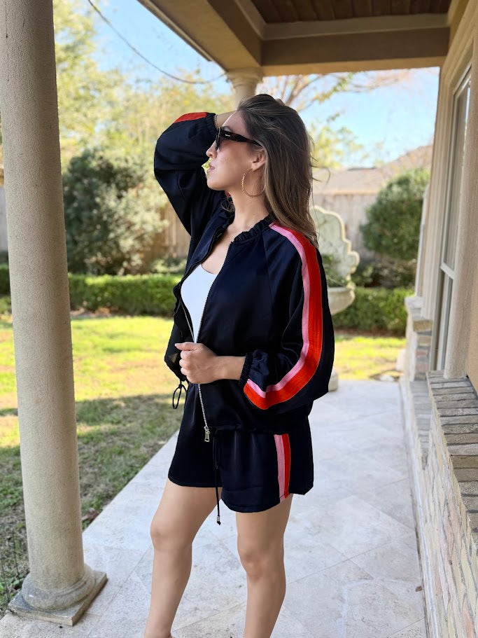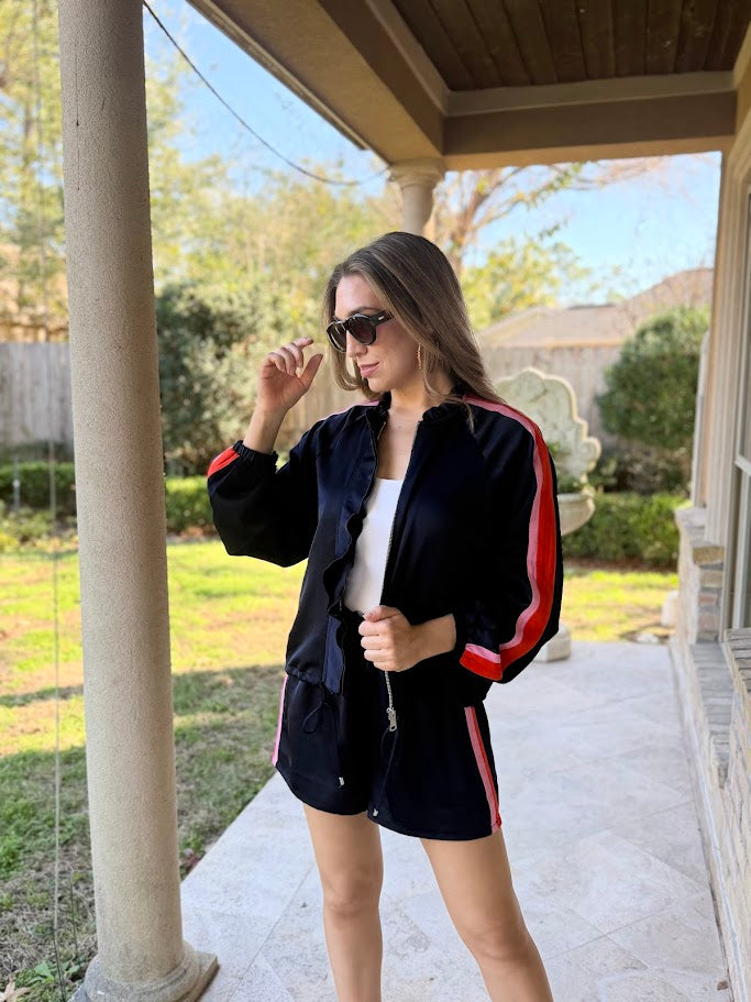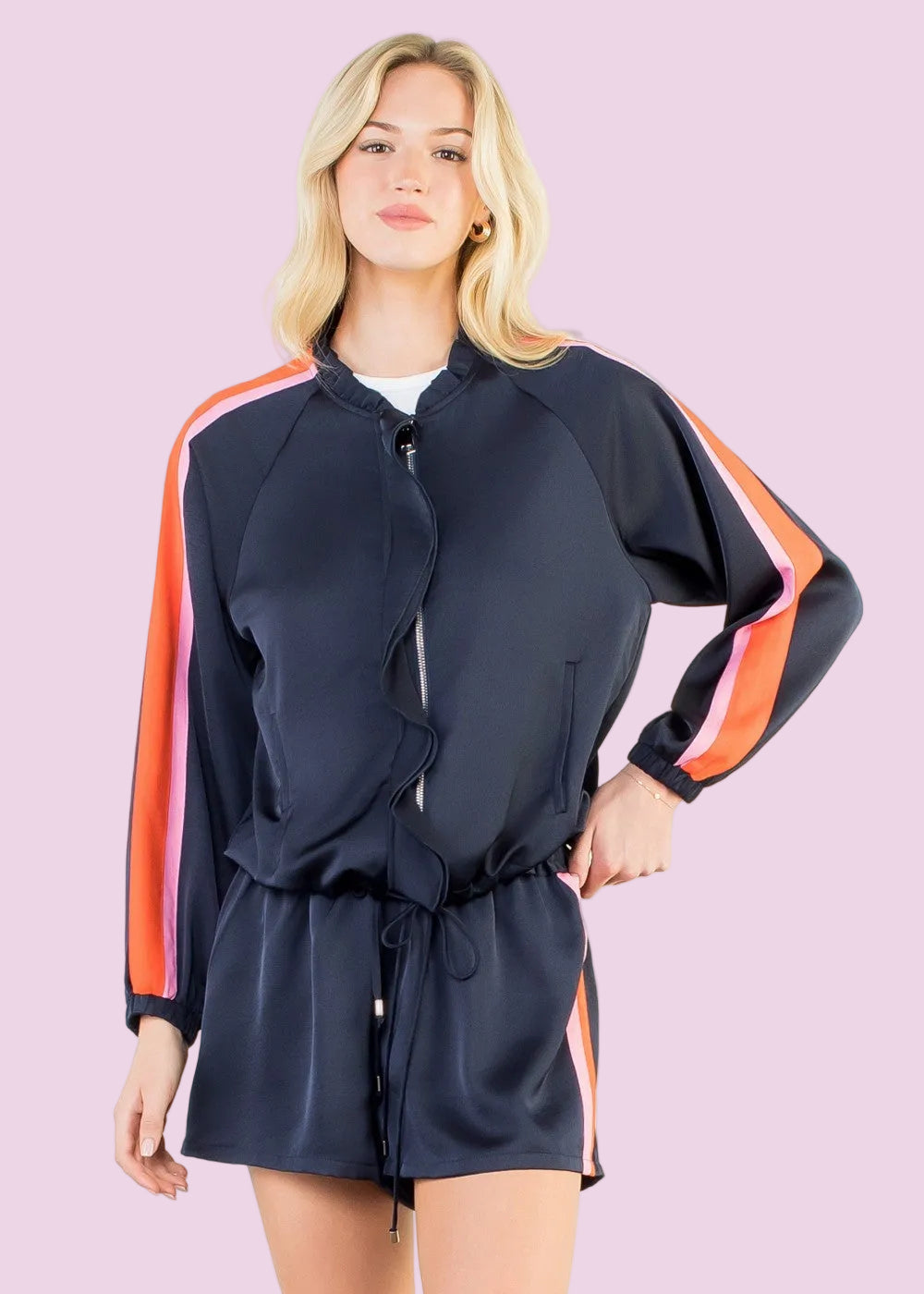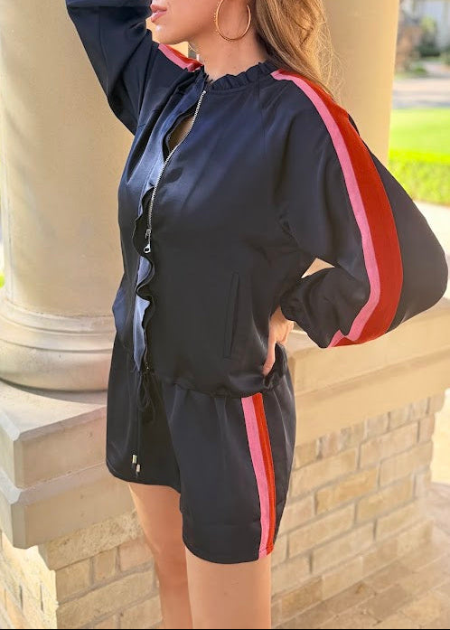 This NAVY SPORTY SPICE TRACK SUIT JACKET features long sleeves, a zip-front closure accented with ruffle detailing for a feminine touch. Designed with contrasting ribbon stripes running down the sleeves, it also includes a drawstring waist for an adjustable fit and functional side pockets for everyday convenience. Pair it with the matching shorts to complete the look.