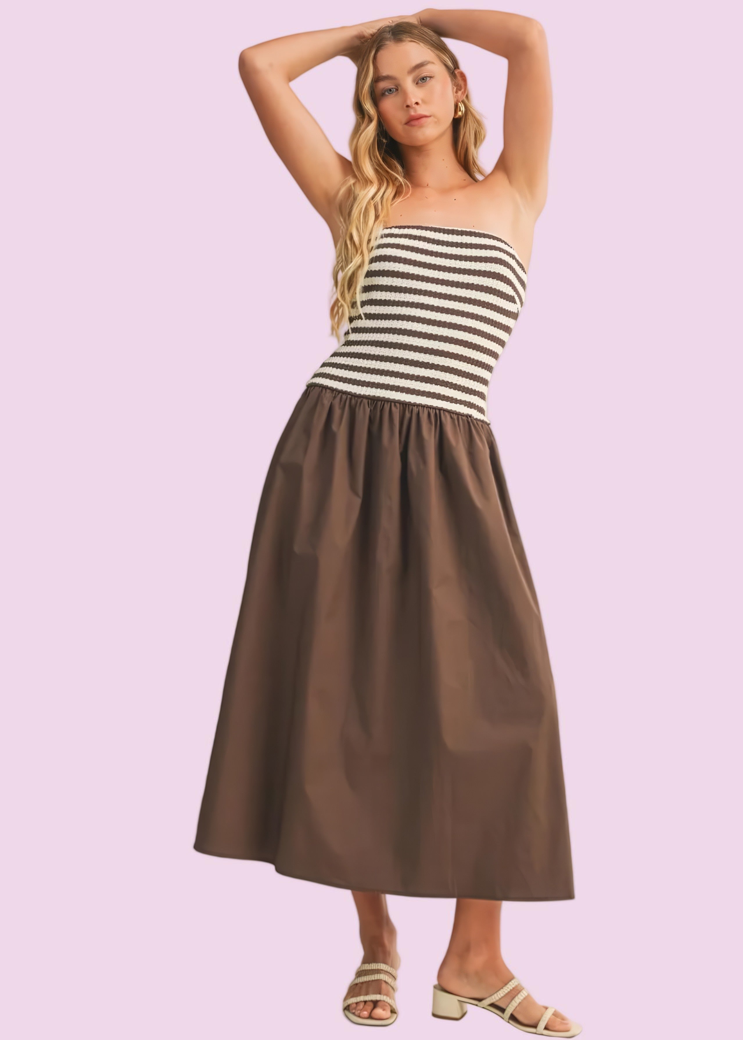 FASHIONABLE FAVE CHOCOLATE STRIPED STRAPLESS DRESS
