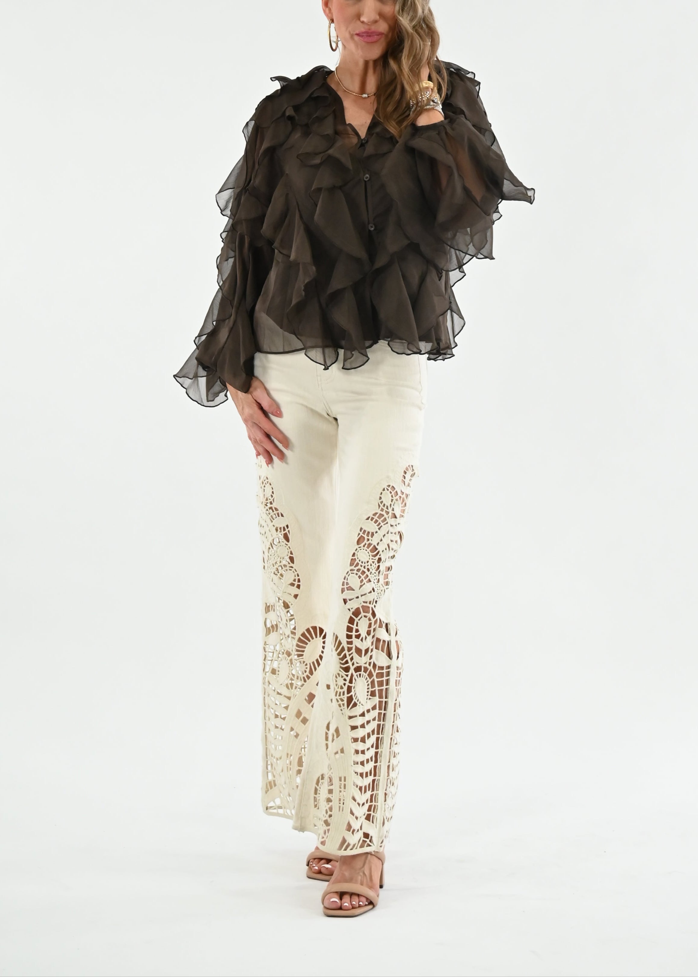 Command attention in the CAUGHT YOUR ATTENTION HIGH RISE LACE WIDE LEG PANTS. These refined high-rise jeans showcase intricate lace embroidery and a wide-leg cut, enhanced by a timeless five-pocket design and exquisite floral cutout detailing along the legs.