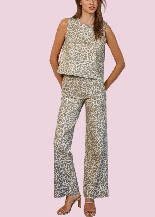 Own your confidence in these show-stopping SHIMMER INSTINCT METALLIC ANIMAL PRINT PANTS! Featuring a dazzling shimmer finish and flowing wide-leg design, they deliver instant sophistication with an undeniable edge. The relaxed fit moves with you effortlessly, making them as comfortable as they are captivating. Pair with the matching tank to create a coordinated look that proves you're not afraid to stand out.
