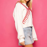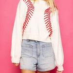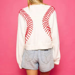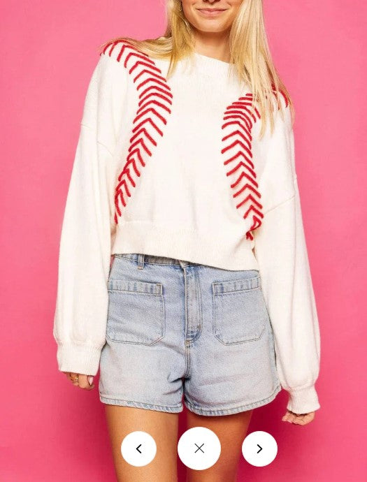 Rule over the baseball season with this QUEEN OF SPARKLES BASEBALL STITCH SWEATER! Adorned with bold red tinsel baseball stitch details. Let your love for the sport shine on the field with this dazzling top. It's the perfect addition to any fan's game day outfit, whether you're a baseball mom or a die-hard supporter. Pair it with red bottoms or denim for an extra stylish touch! This sweater is a surefire way to hit a home run in the fashion game.