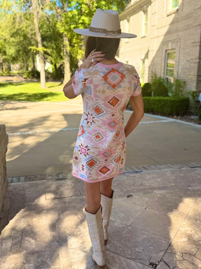 Step into the spotlight with this QUEEN OF SPARKLES PINK MULTI SEQUIN AZTEC PRINT DRESS—where Western flair meets full-on glam. Featuring a stunning pink multi-sequin Aztec print knit, this button-up style captures rodeo-inspired elegance with a dazzling edge. The shimmering sequins catch the light with every movement, while the structured silhouette keeps your look polished and put-together. Whether you're heading to a special event or just want to turn heads, this dress delivers the perfect blend of playful sparkle and sophisticated charm. Pure magic for anyone ready to shine.