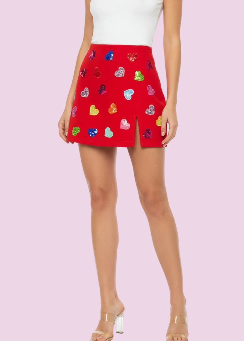 Turn heads and steal hearts in the QUEEN OF SPARKLES: RED MULTI RHINESTONE HEART SKIRT. This statement mini features vibrant multicolor rhinestone hearts scattered across a bold red base, bringing sparkle and personality to every step. Fun, flirty, and unapologetically festive, this skirt is made for Valentine’s celebrations, themed parties, or anytime you want to shine a little brighter. **Built-in shorts.**