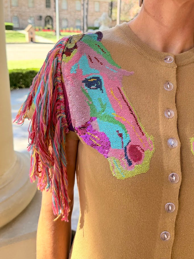 QUEEN OF SPARKLES FRINGE HORSE HEAD BUTTON UP KNIT DRESS