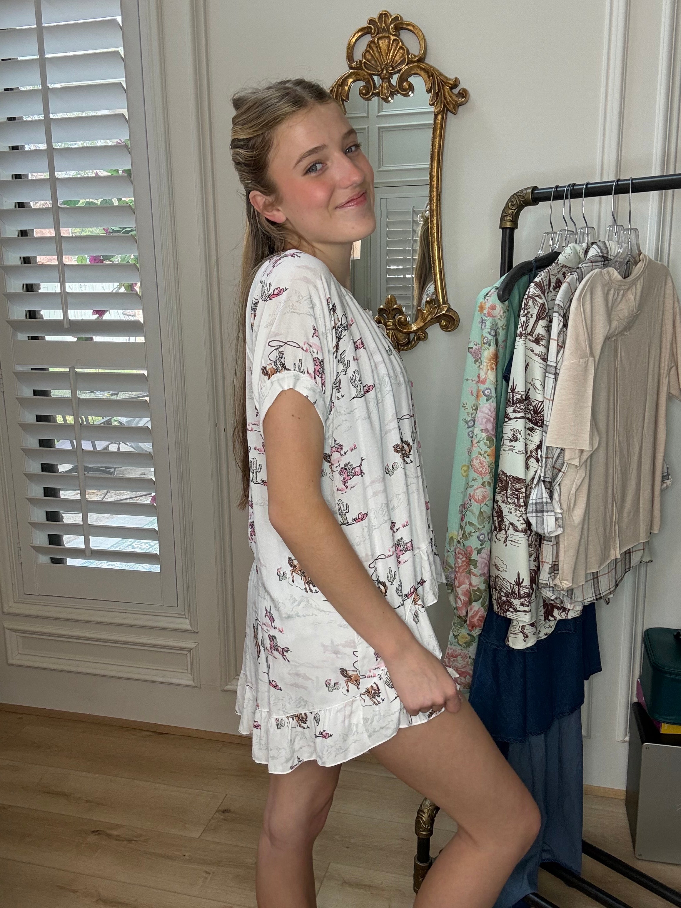 Lasso your dreams with this LASSO LADY WESTERN PAJAMA SET featuring adorable cowgirl motifs—lassos, boots, and ranch-style details—this set brings playful personality to your sleepwear. The hi-lo button-up top pairs perfectly with ruffled shorts, both crafted from soft, breathable Lyocell blend fabric that keeps you cool and cozy all night long. Practical pockets and a decorative contrast waistband tie add functional flair, while the charming lasso lady print celebrates your inner cowgirl. Includes a reusable satin-drawstring bag, making this the perfect gift or treat-yourself moment for anyone who loves western vibes with a modern twist.