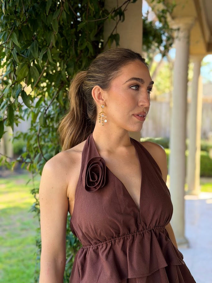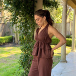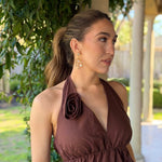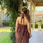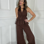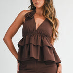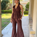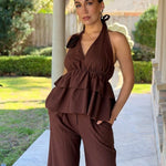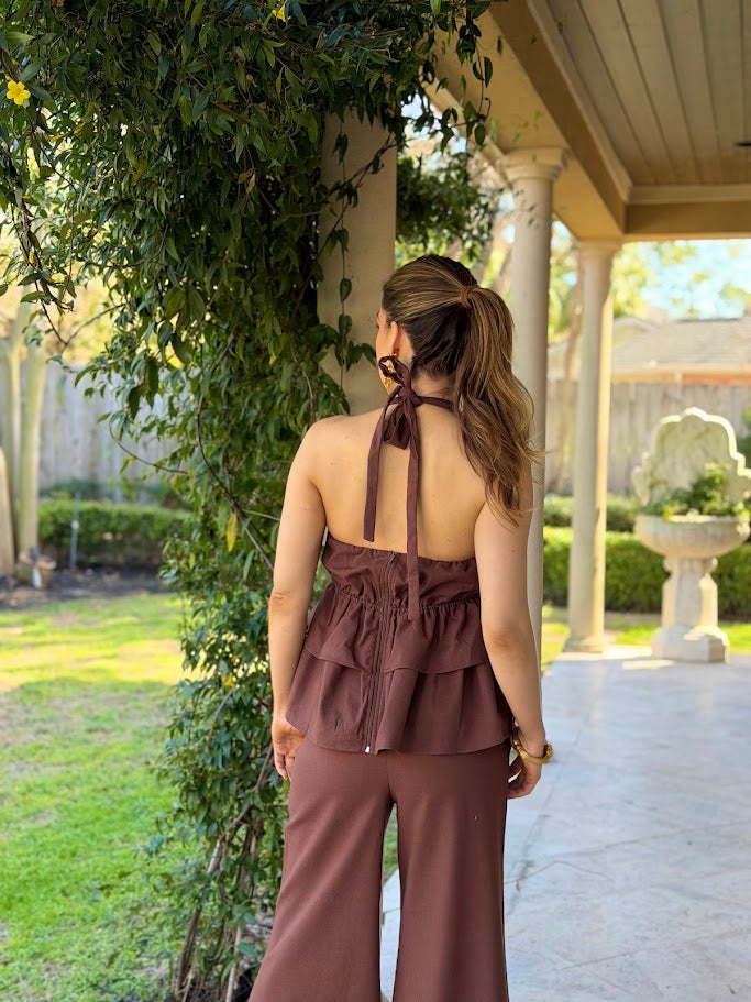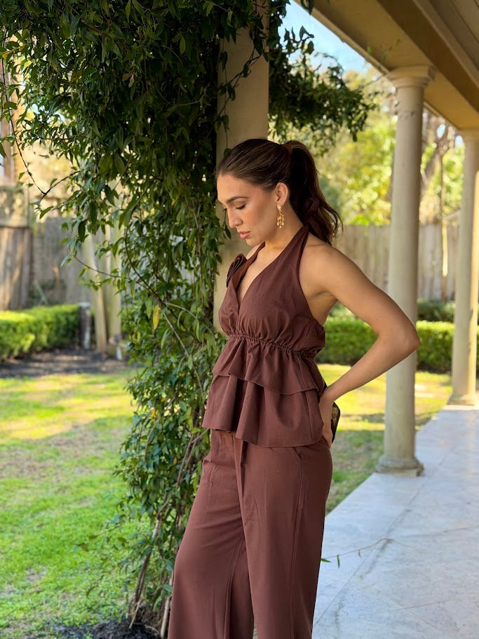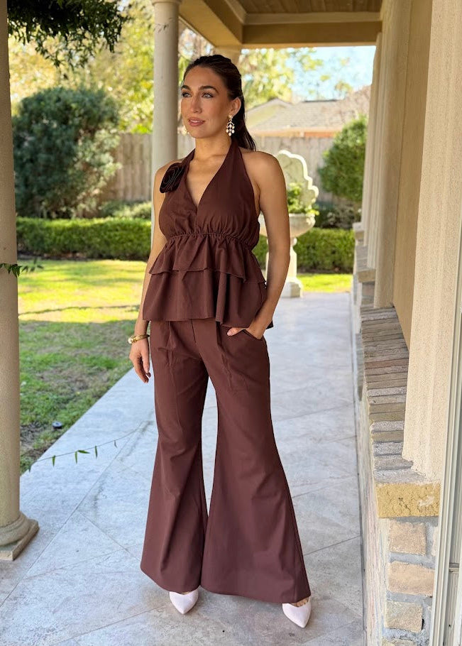 Elevate your wardrobe with this effortlessly chic ALL THE FEELS CHOCOLATE PANT SET, crafted in a rich chocolate brown hue. The set features a dramatic halter top with tiered ruffle layers and a flattering plunge neckline, secured with a romantic tie at the neck and finished with a rosette detail for a bold, feminine touch.