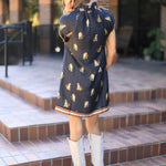 Embrace your bold side with the WILD INSTINCT LEOPARD PRINT DRESS! Featuring a striking black leopard print, this dress offers a ruffled collar, flattering V-neckline, and drop shoulders accented with contrasting ribbon stripes at the shoulders and hem. Plus, it includes convenient pockets for everyday ease.