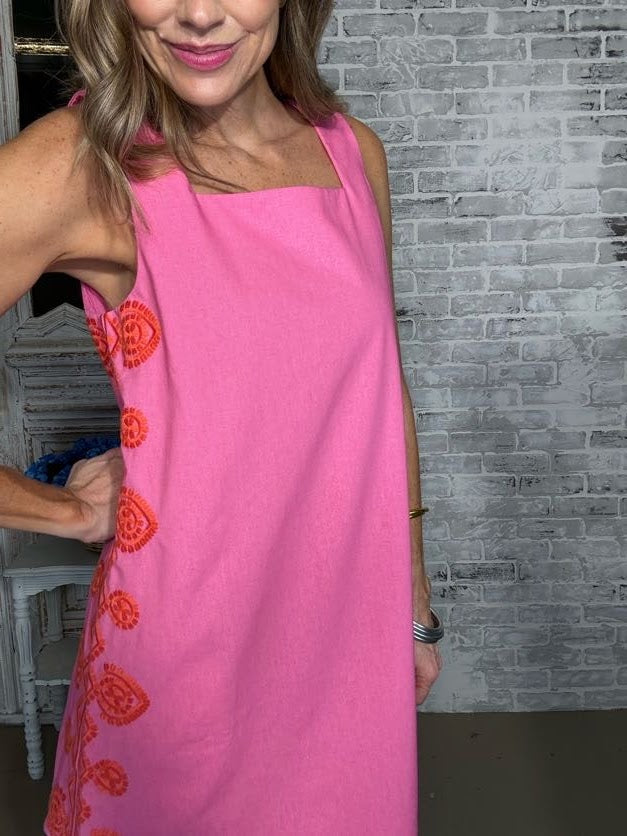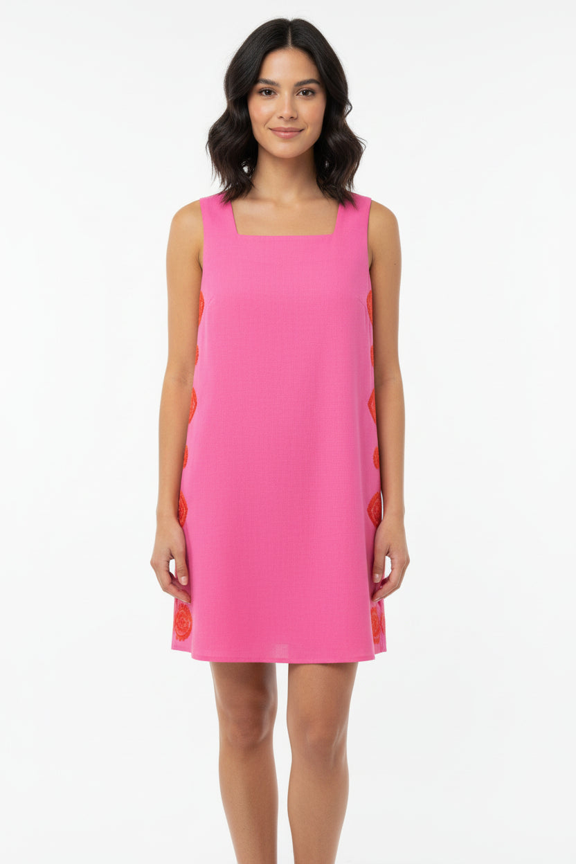 Elevate your wardrobe with this FLOWER PICKING HOT PINK EMBROIDERED MINI DRESS, featuring delicate medallion embroidery that adds timeless charm. The square neckline and relaxed shift silhouette create a flattering, comfortable fit perfect for casual outings or garden-inspired occasions. Crafted for effortless style, this dress pairs beautifully with sneakers for a laid-back look or heels for an evening out. A versatile piece that brings color and personality to any season.
