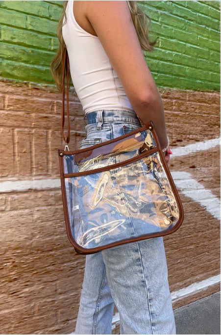 Introducing our Posie Clear Crossbody Purse, perfect for your on-the-go lifestyle! This clear version is ideal for game day outings, allowing you to showcase your essentials effortlessly. Posie features a convenient top zipper closure and a front open pocket for easy access to your belongings. Complete with a matching adjustable and detachable guitar strap, Posie offers versatility in styling. Its trim is crafted from vegan leather, ensuring a cruelty-free accessory choice. With dimensions measuring 10"L x 10"H x 2.5"D, Posie combines practicality with contemporary style.