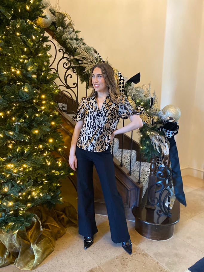 Make an entrance with this eye-catching UPTOWN HAPPY HOUR METALLIC CHEETAH PRINT TOP that blends bold style with wearable sophistication. The striking gold and black pattern commands attention, while thoughtful details—a ruffled collar, flattering V-neckline, and adjustable puff sleeves with ties—ensure you look polished from happy hour to night out. Perfect for anyone ready to elevate their wardrobe with a piece that's equal parts glamorous and fun.
