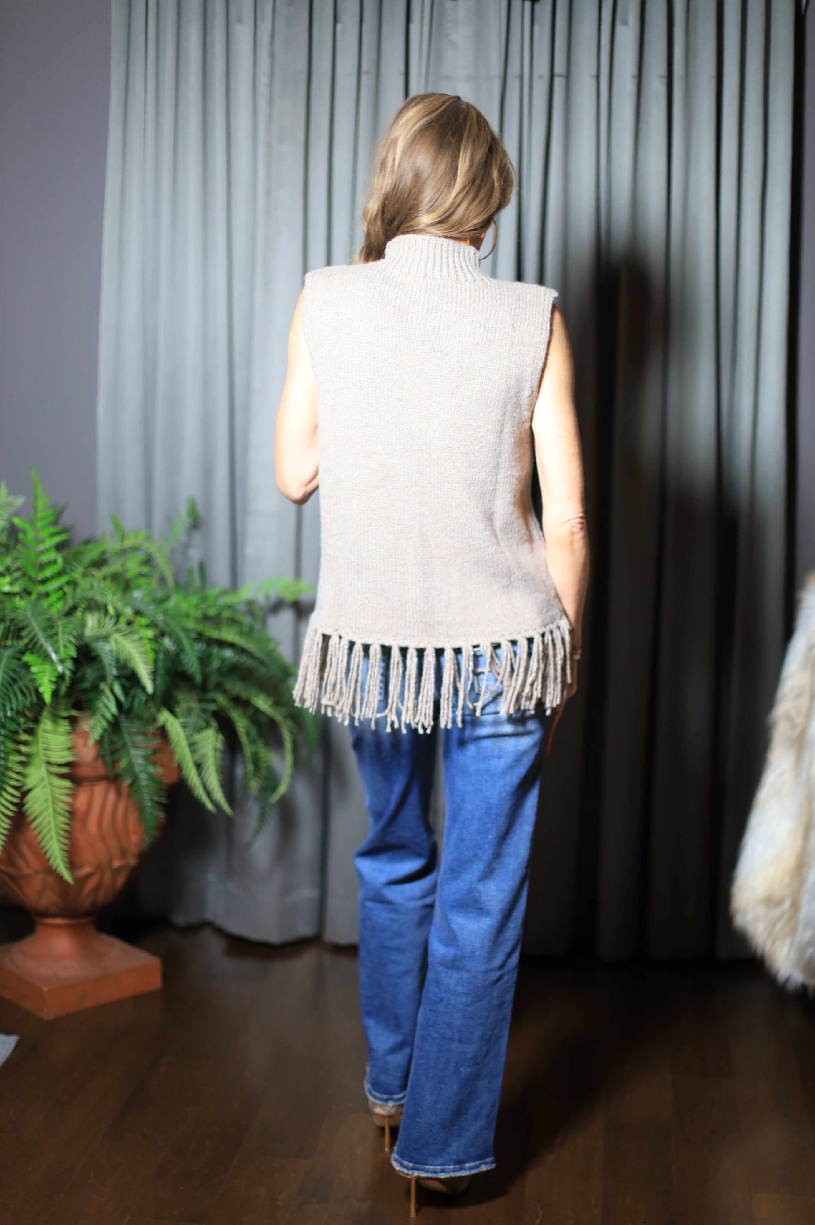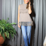 Embrace timeless charm with the ALWAYS COZY FRINGE SLEEVELESS SWEATER in taupe, showcasing a ribbed mock neck and subtle fringe along the bodice and hemline that add elegant, standout details to any ensemble.