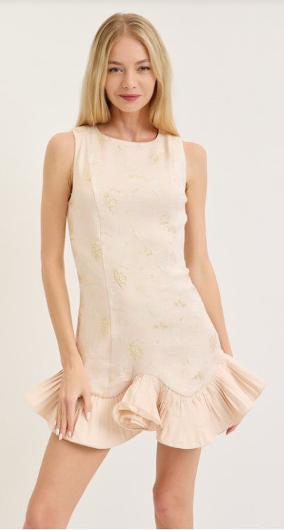 The FEELING ROMANTIC PALE PINK MINI DRESS is crafted from jacquard fabric highlighted with subtle gold and ivory accents and finished with a ruffled hemline. This delightful dress promises to be a favorite piece in your wardrobe for years to come.