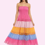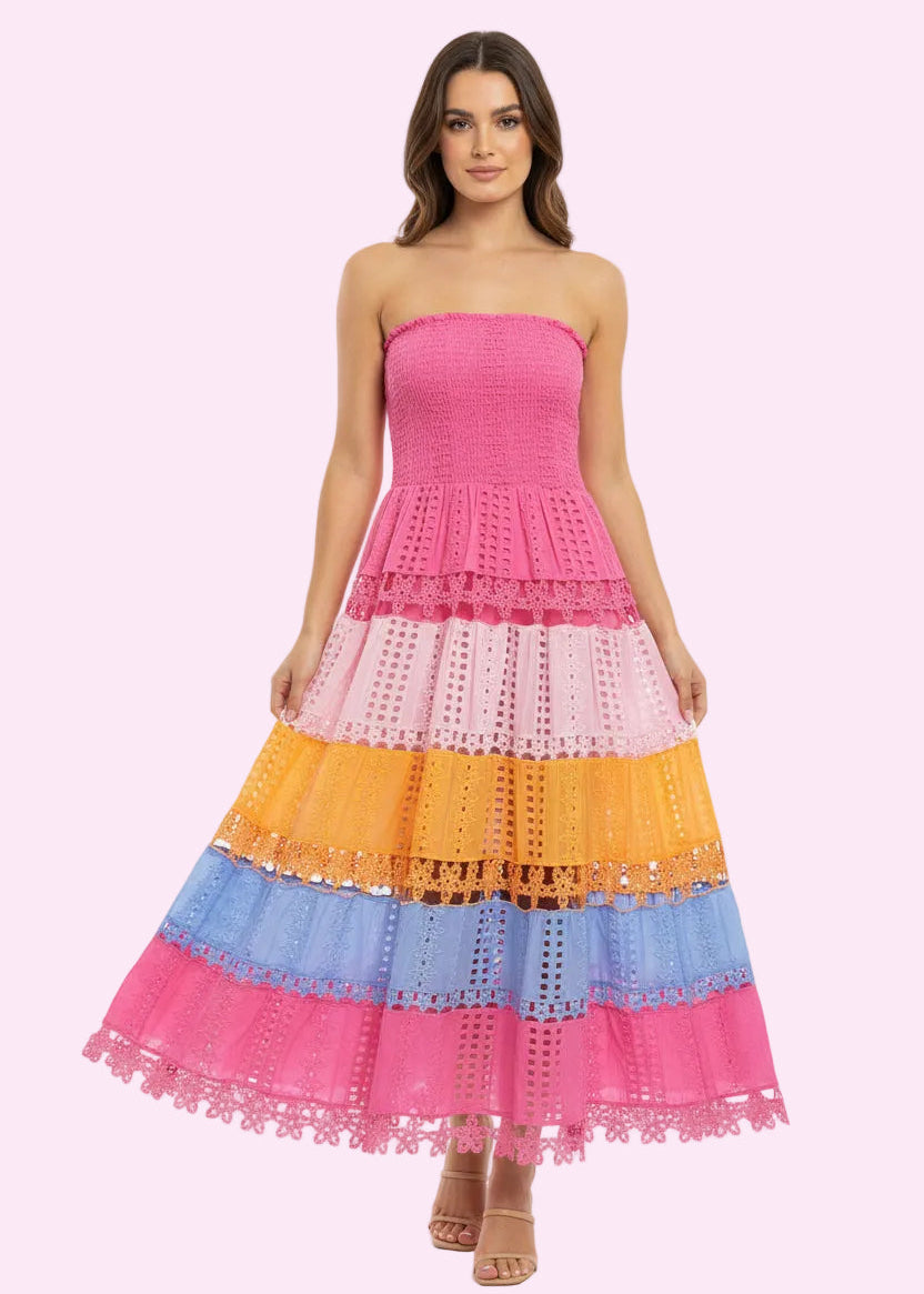 Beat the heat without sacrificing style in this ESCAPE TO PARADISE COLORBLOCK EYELET DRESS. The strapless silhouette features a fitted smocked bodice and soft cotton-blend fabric adorned with delicate embroidered eyelets and scalloped crochet lace trim. A midi cut with half lining ensures all-day comfort and movement. Throw on your favorite sandals and some bold jewelry, and you're ready to turn heads at every warm-weather occasion.