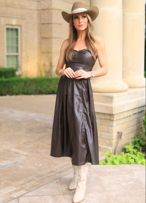 Introducing the ONLY GETS BETTER FAUX LEATHER MIDI DRESS in a rich chocolate shade. This strapless style features pintucked details, a flattering A-line silhouette, and a back zipper, combining bold texture with elegant shape for a striking look.