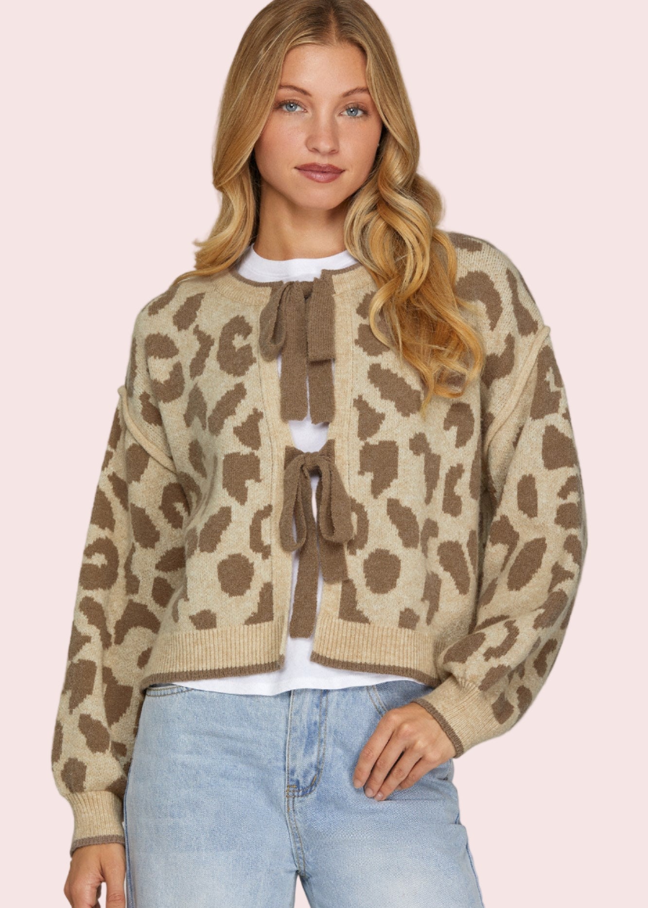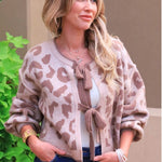 The FLIRTY FEELINGS LONG SLEEVE BOW TIE CARDIGAN features a chic leopard print and a stylish bow tie design. This long-sleeve sweater cardigan adds a bold and fashionable touch to any outfit, perfect for making a confident statement.