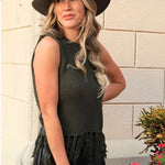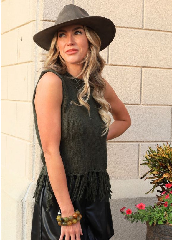 The CAFE SOCIAL OLIVE GREEN FRINGE SWEATER is a sleeveless knit top in a charming olive green shade, featuring a crew neckline and playful tassel details along the hem. Crafted from soft, lightweight fabric, it offers all-day comfort and works perfectly layered or solo, no matter the season.