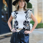 Elevate your style with the UPTOWN MANHATTAN SLEEVELESS SWEATER. This ecru sweater features a bold floral print, a ribbed mock turtle neck, and a relaxed drop shoulder design—all without sleeves for a chic, modern look.