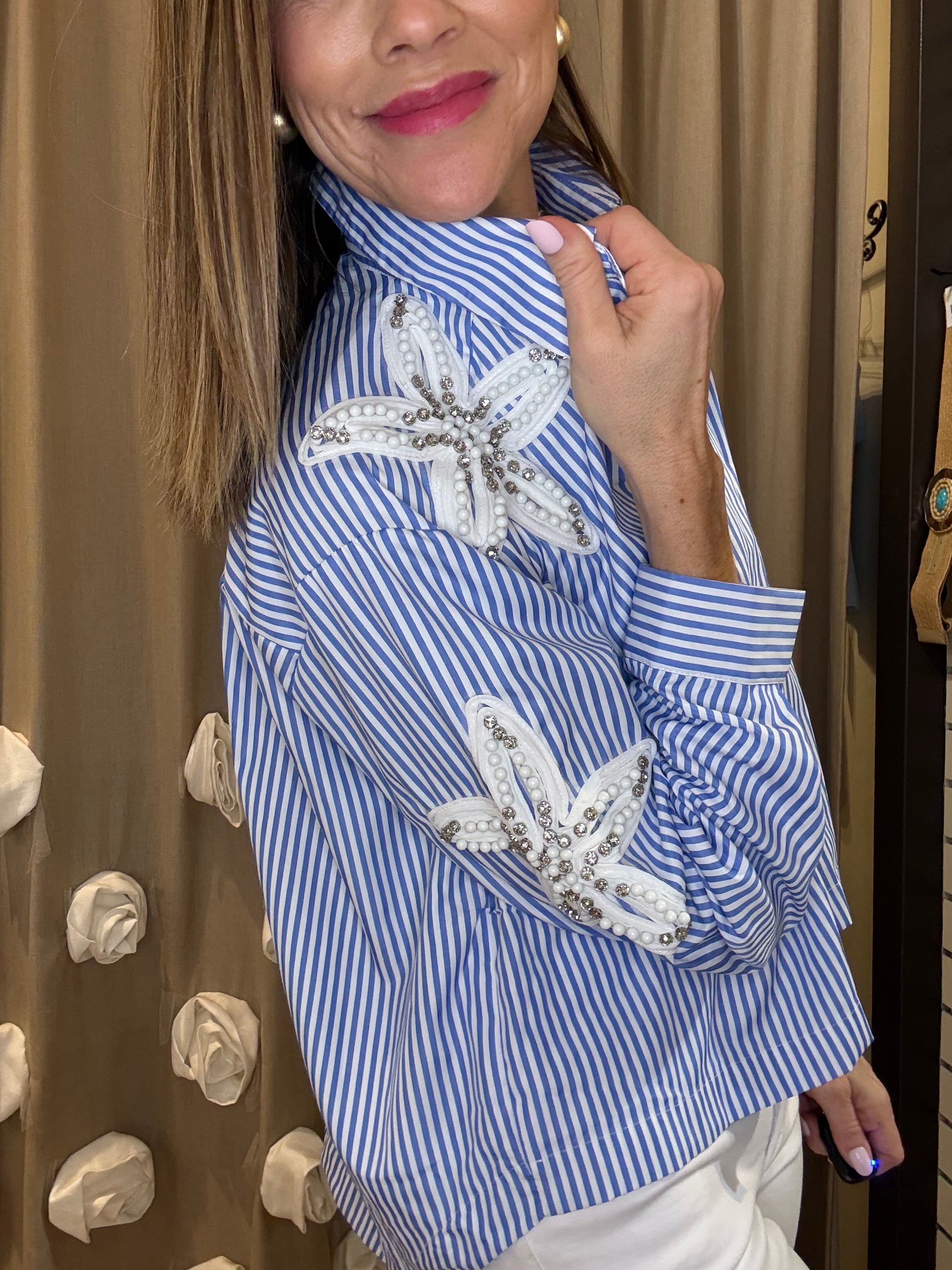 BEACH HOUSE BRUNCH BLUE STRIPE SHIRT WITH EMBELLISHED FLOWERS