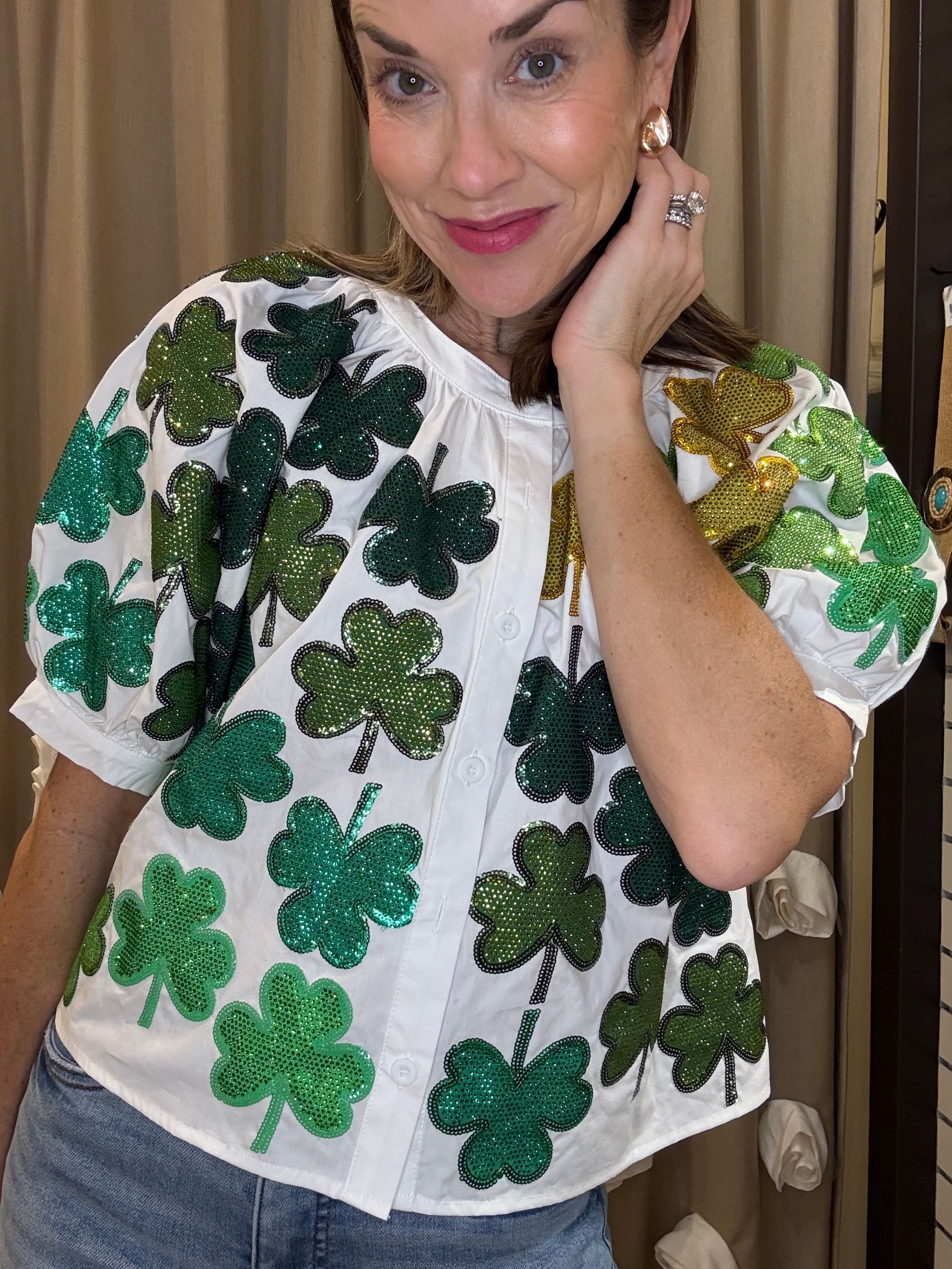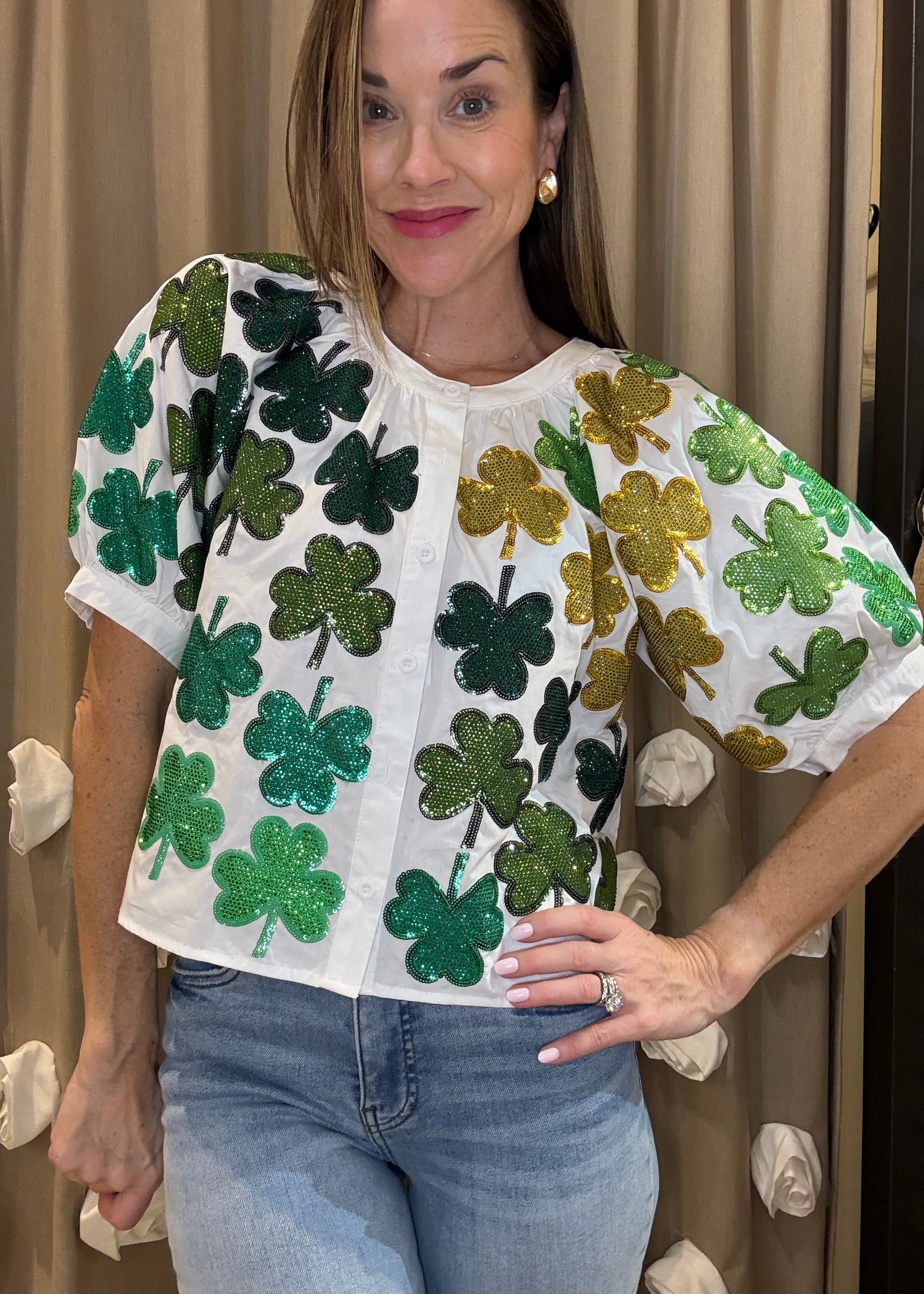 QUEEN OF SPARKLES RHINESTONE SHAMROCK BUTTON UP BLOUSE
