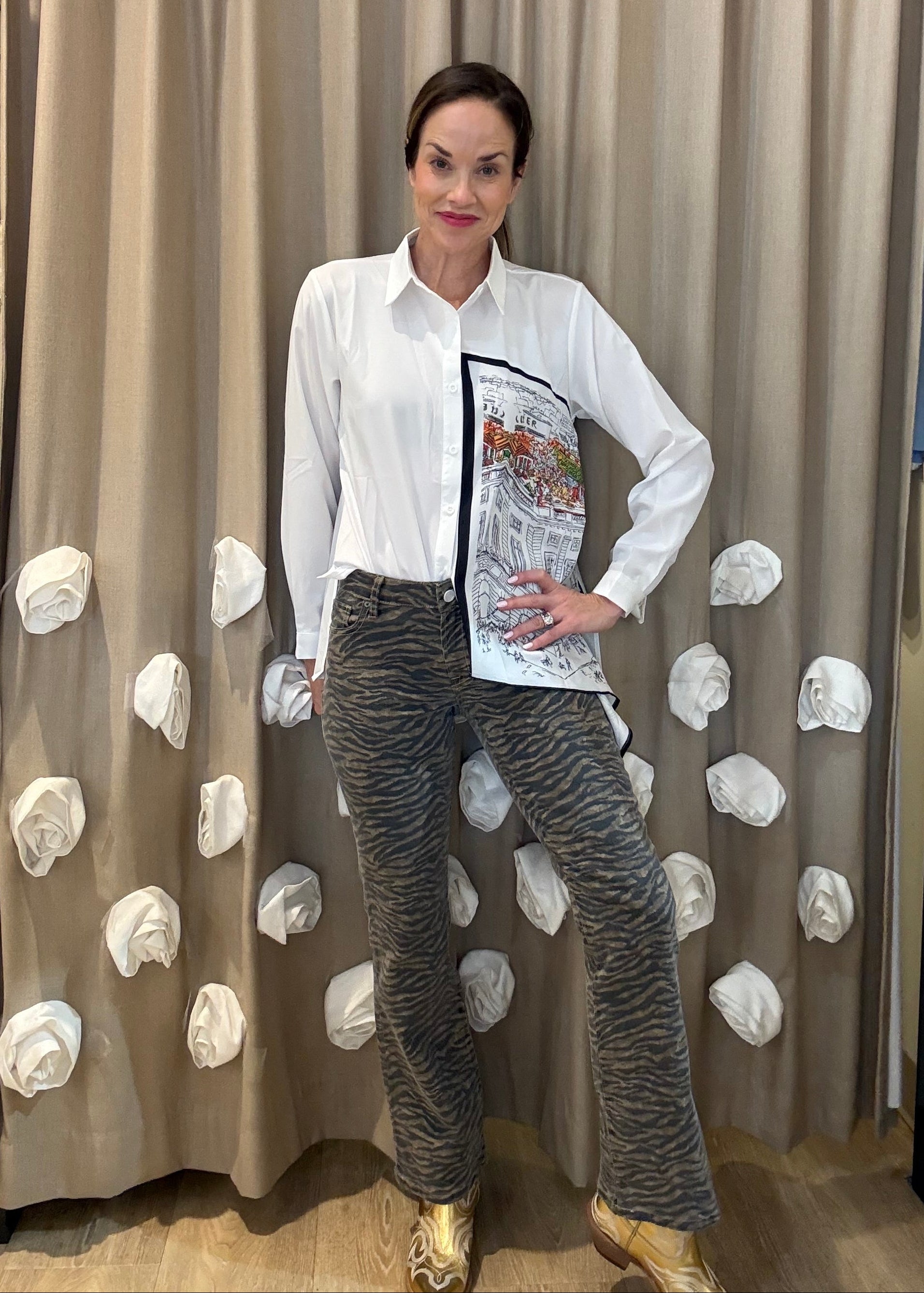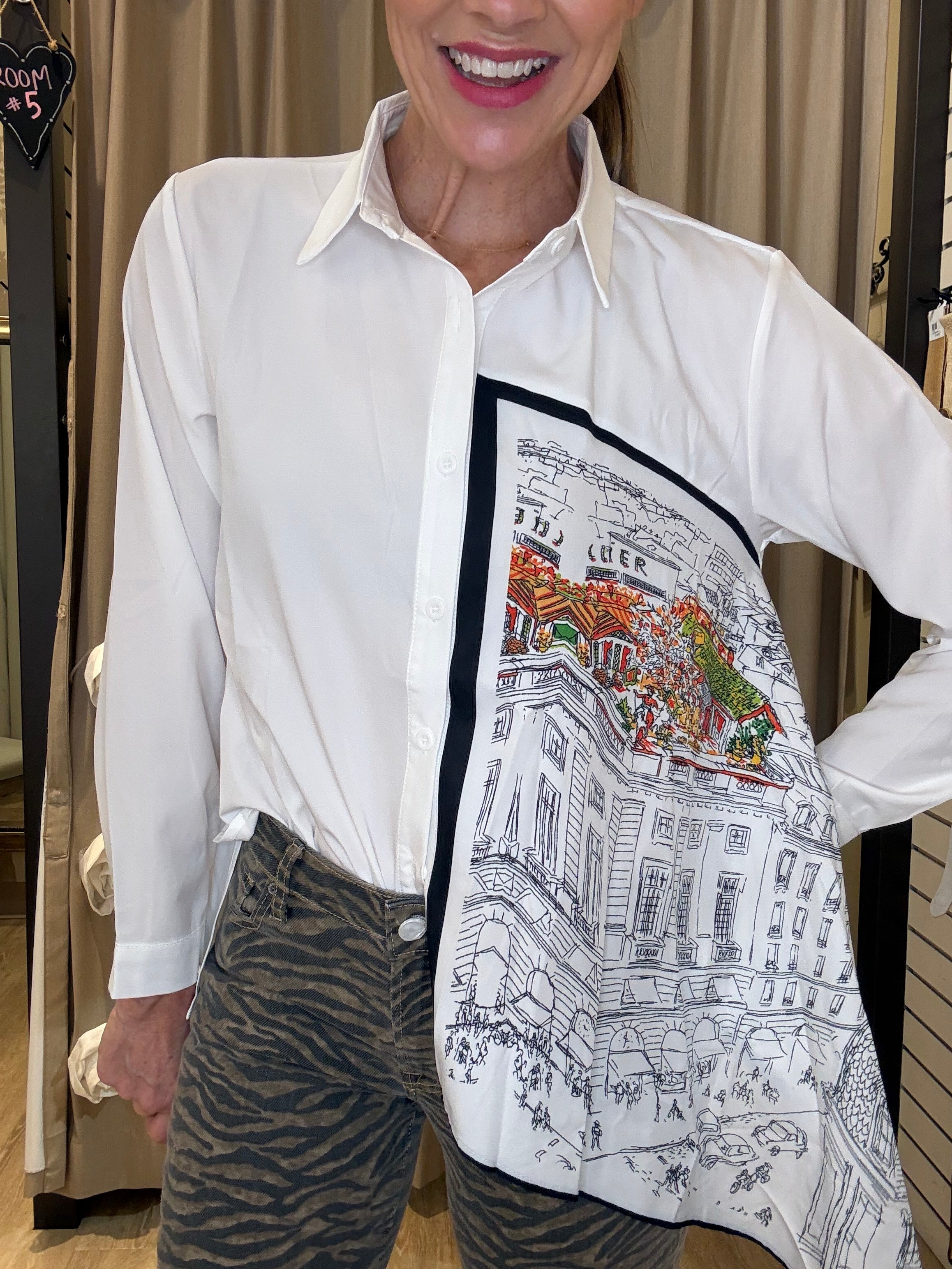 EVENING IN PARIS LONG SLEEVE GRAPHIC BLOUSE