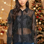 Make a sophisticated impression with this elegant FLORAL FLAIR BLACK BUTTON DOWN BLOUSE that combines timeless tailoring with modern flair. Sheer fabric creates an effortless elegance, while dimensional crystal-adorned flowers add unexpected glamour to the classic collar and long sleeves. Whether dressed up for special occasions or layered for everyday wear, this versatile piece brings luxury details that elevate any wardrobe.