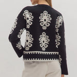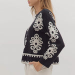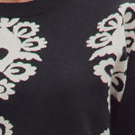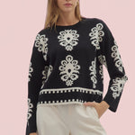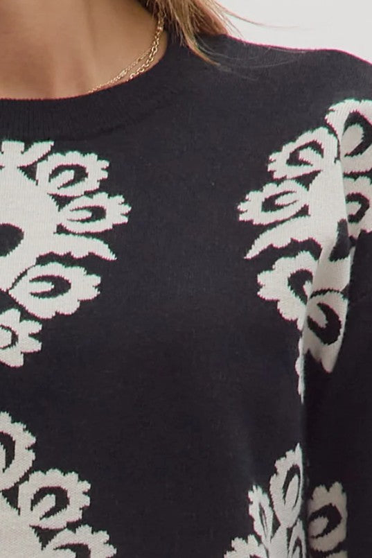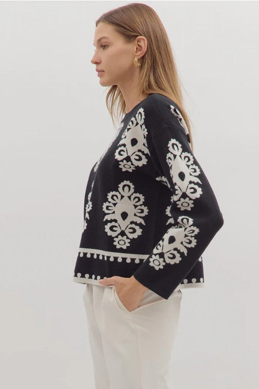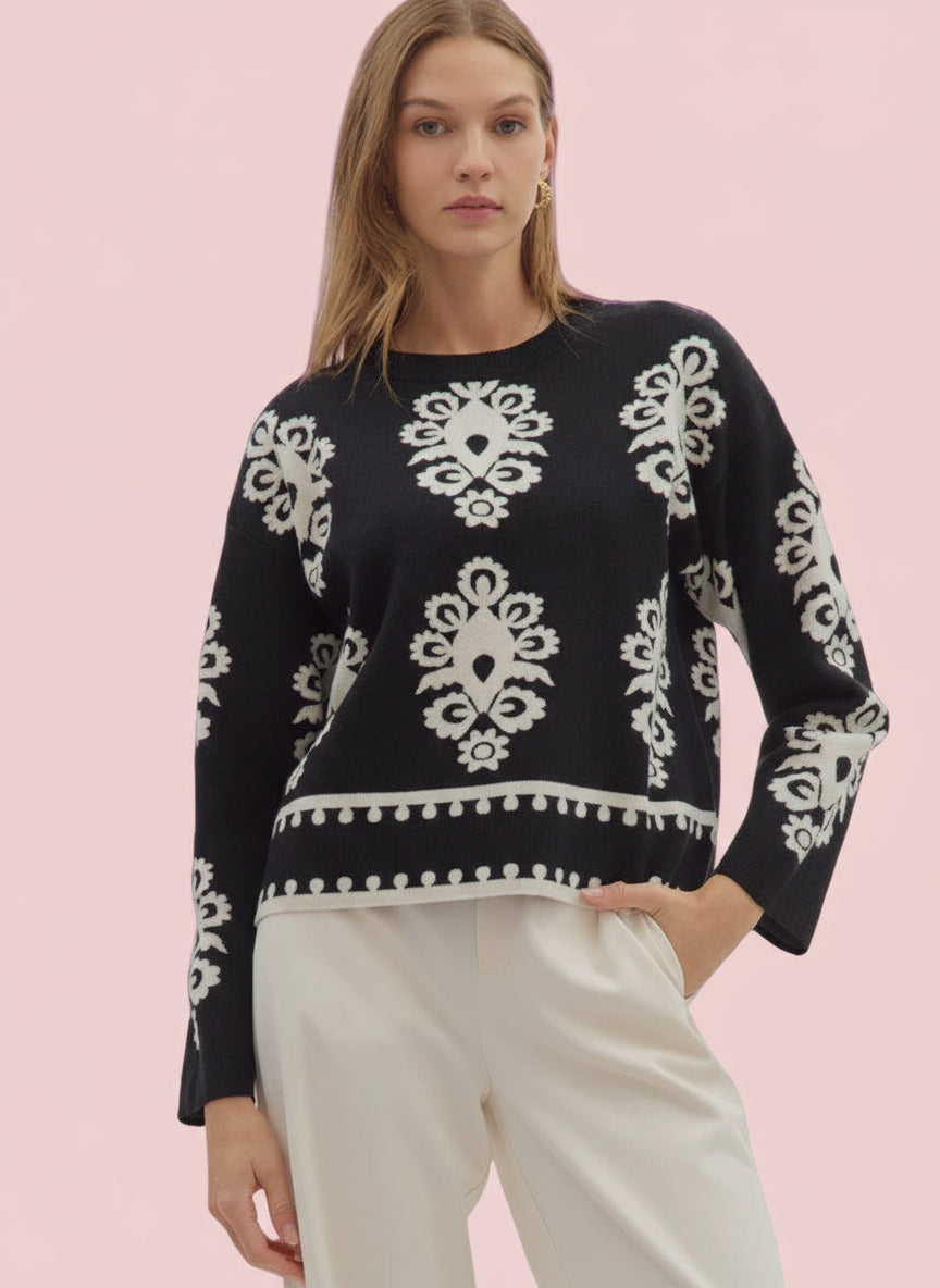 Feel fabulous from brunches to uptown outings in this UPTOWN EASE BLACK SWEATER TOP! This sweater combines understated elegance with everyday wearability. The ornate botanical print adds visual depth while the ribbed crew neck anchors a refined aesthetic. Long sleeves and a relaxed, straight-hemmed silhouette create a flattering fit that works for any occasion.