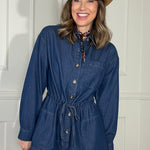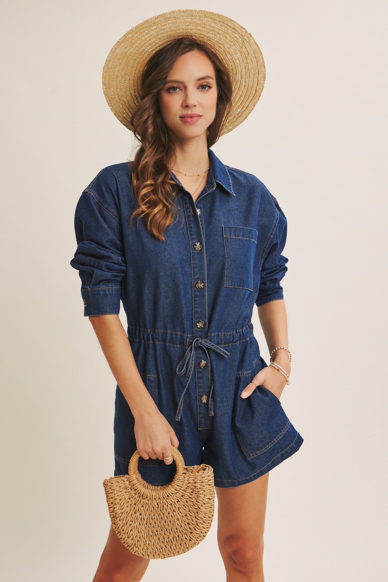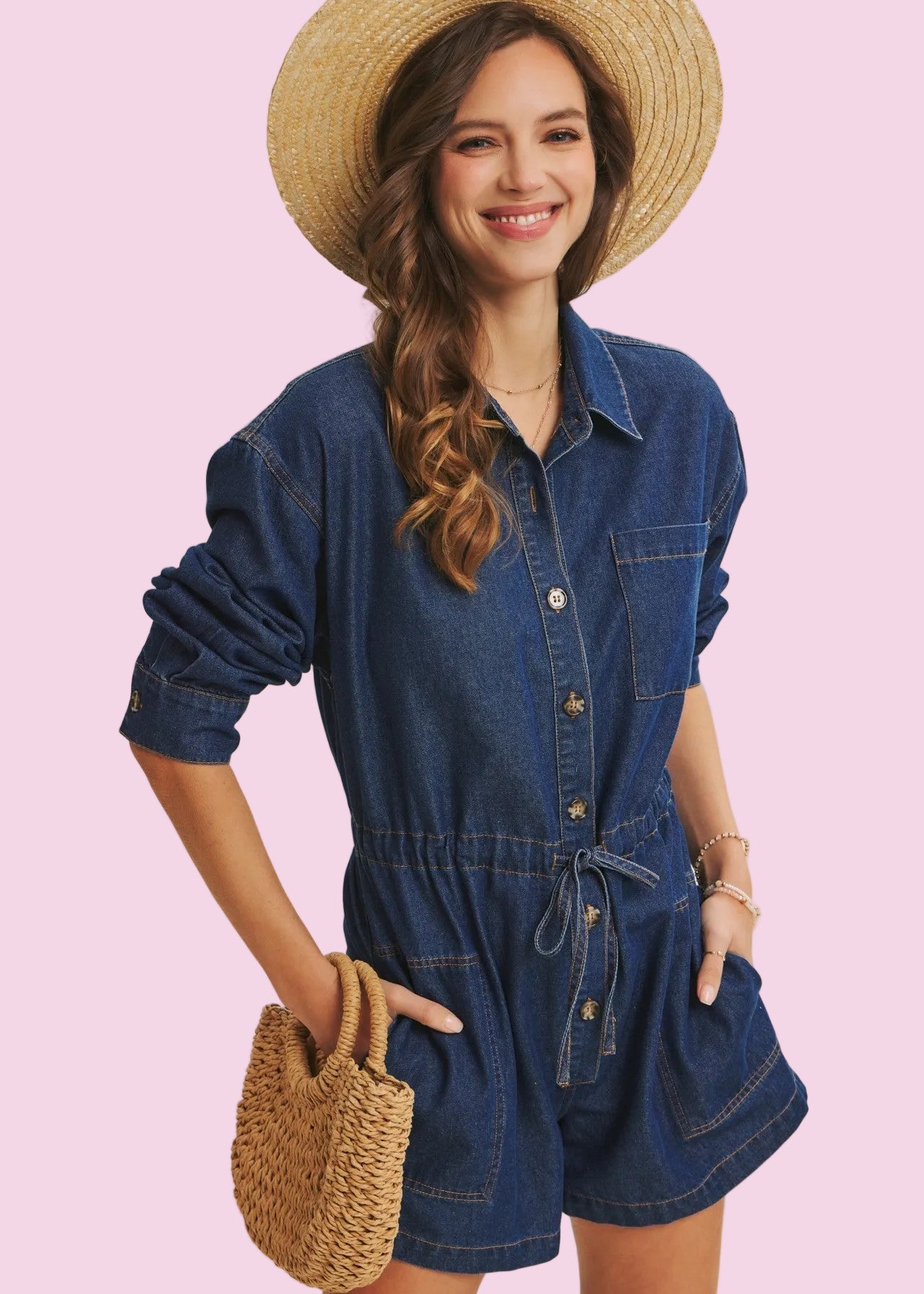 Meet your new go-to EASY DOES IT LONG SLEEVE DENIM ROMPER that makes getting dressed a breeze. Crafted in soft washed denim, this playful one-piece features a sharp collared neckline and button-down front for that effortless vibe. The oversized cut keeps things comfy, while the adjustable drawstring waist lets you customize your silhouette. Button-cuffed long sleeves add a touch of polish, and those roomy side pockets are basically a love letter to functionality. Perfect for spring strolls, this romper proves that laid-back style never goes out of style.