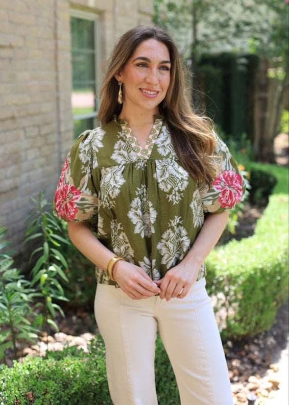The GARDEN SERENADE EMBROIDERED SLEEVE FLORAL BLOUSE features an olive floral pattern with beautifully embroidered sleeves. It has a flattering V-neckline and a straight hemline for a comfortable, stylish fit.