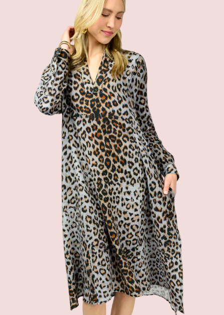 The UNCLE FRANK Leopard Guaze Midi Dress is a playful nod to wild style with its lightweight, breezy fabric featuring a bold animal print. Designed for comfort and flair, it includes convenient functional pockets, a flattering v-neckline, and breezy side slits that add movement and charm. This dress is the perfect transition piece into fall — effortlessly pair it with boots for an edgy look, slides for casual vibes, or sneakers to keep things fun and fresh.