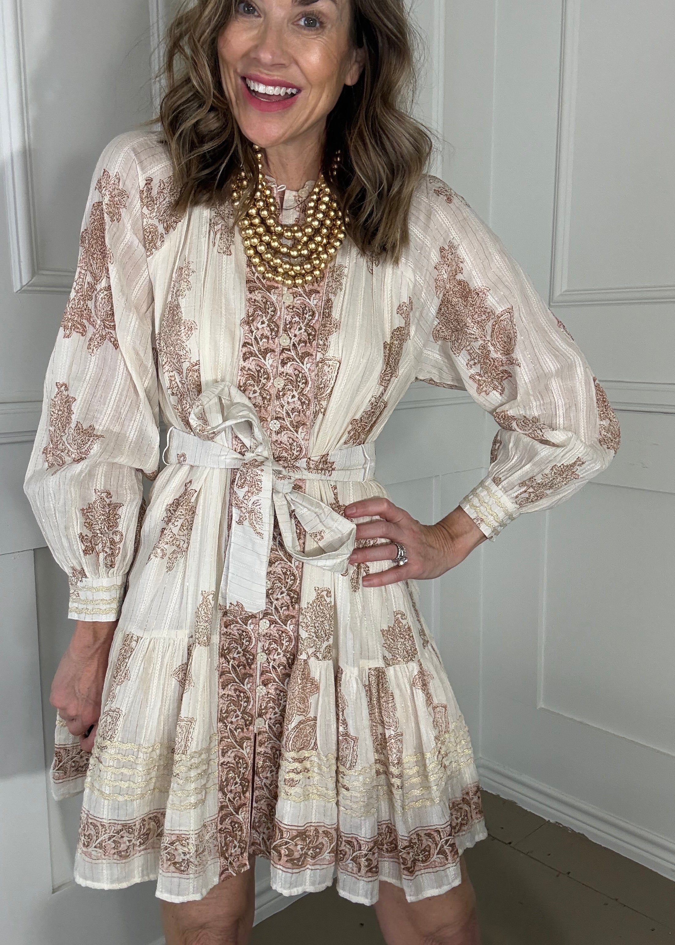 Elevate your wardrobe with this fabulous UNCLE FRANK METALLIC TRIM PAISLEY DRESS featuring a stunning paisley print accented with shimmering metallic trim. This long-sleeve button-down dress boasts a flattering belted waist and charming tiered silhouette that moves beautifully with you. Perfect for turning heads at any occasion!