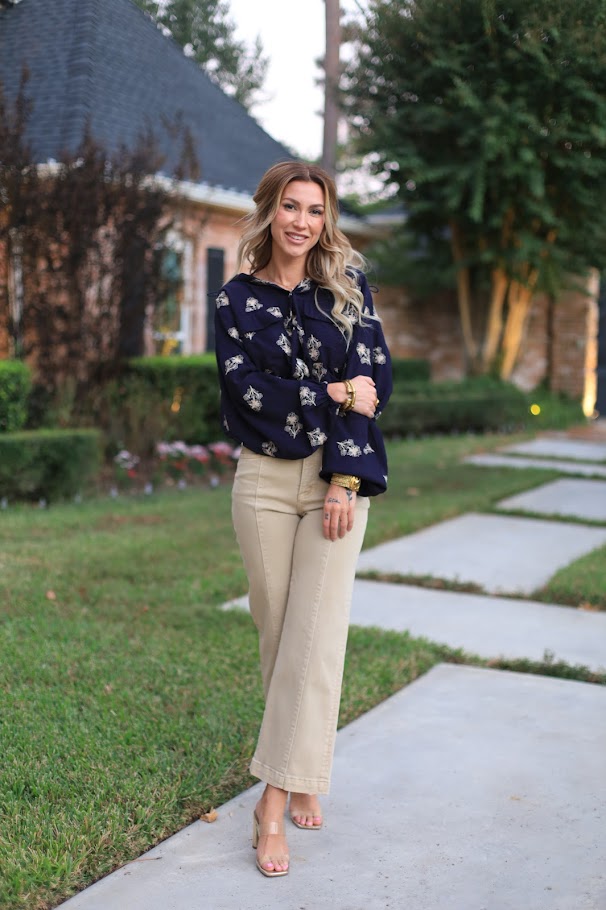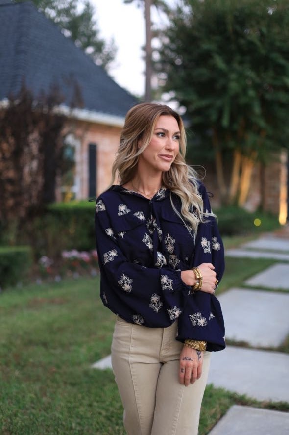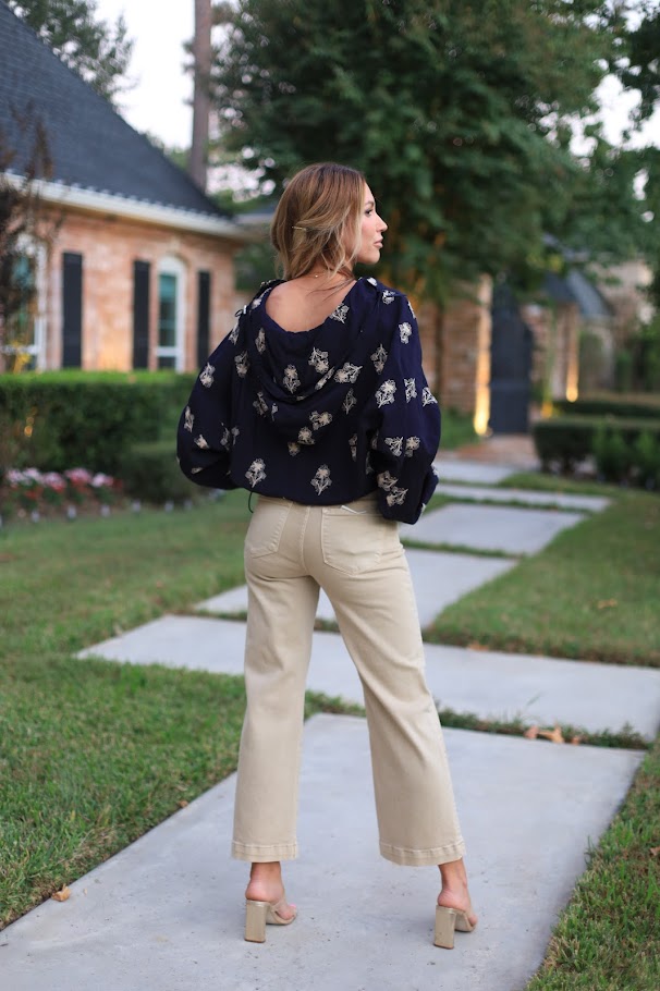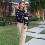 Meet the STATEMENT MAKER HOODED EMBROIDERED JACKET in navy—your new favorite go-to! Featuring detailed embroidery, a snap-front closure, a stylish hood, front pockets, and drawstring gathers on the sides, it’s designed to turn heads and keep you comfy all day.