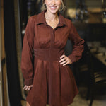This AUTUMN STROLLS BURGUNDY SUEDE MINI DRESS features long sleeves, a chic v-neckline, a structured boned waist, and a flirty pleated skirt. It’s your go-to for a stylish shopping spree on those crisp fall afternoons.