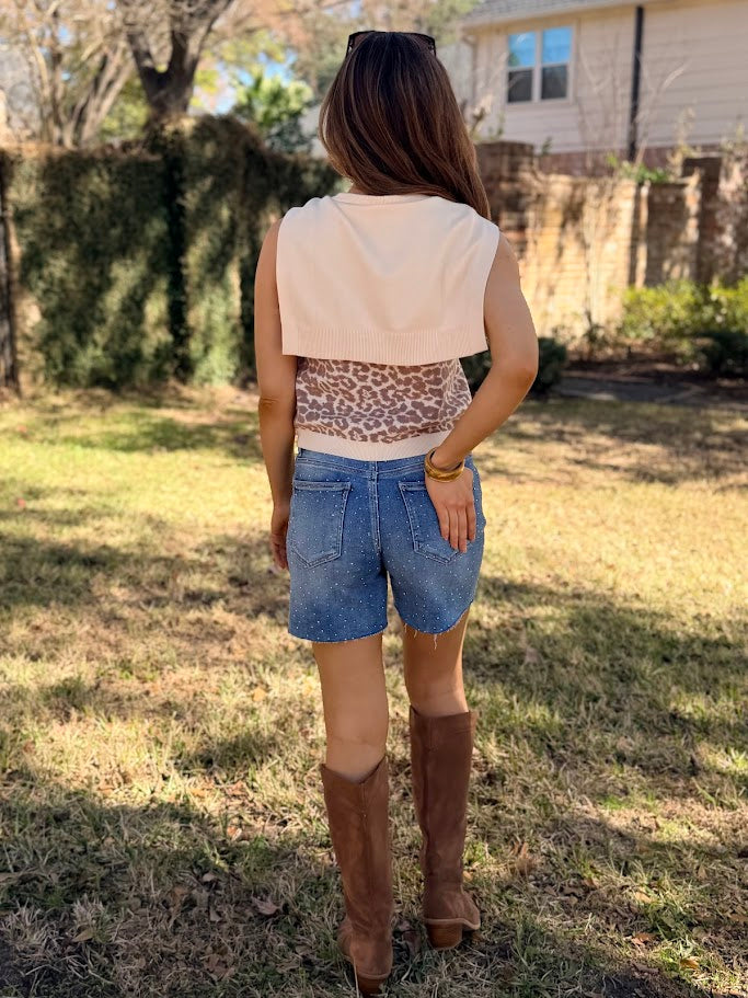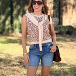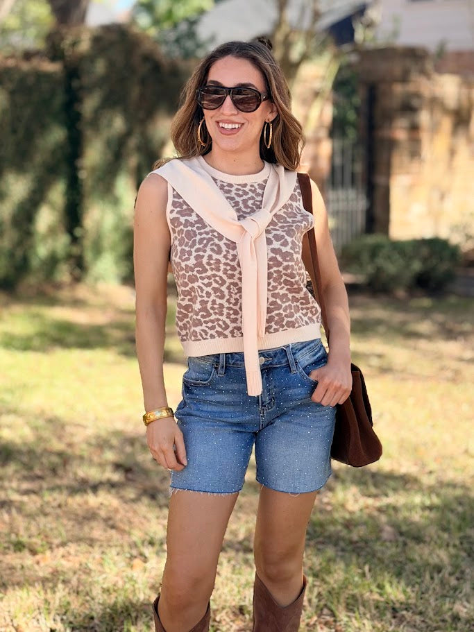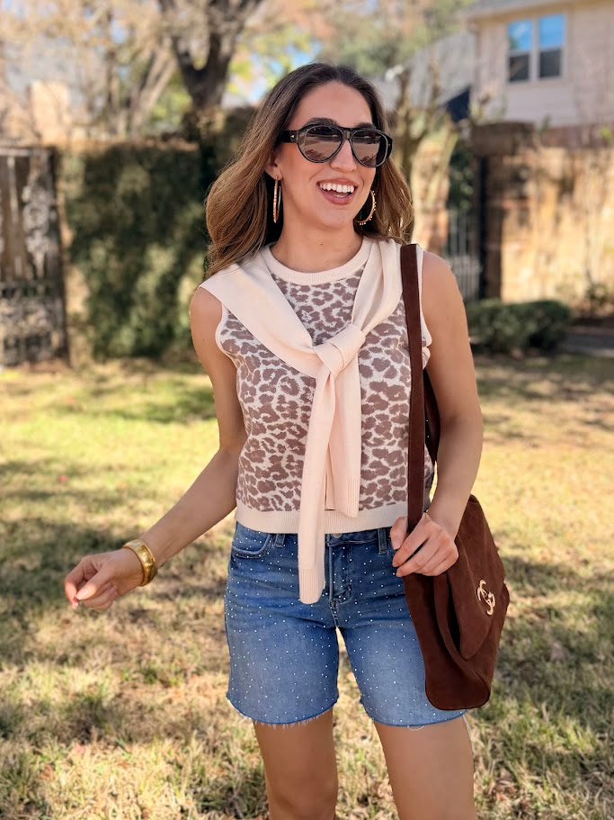 Unleash your wild side with this sleeveless WILD AT HEART ANIMAL PRINT SWEATER that's anything but basic. Featuring a gorgeous leopard pattern in warm, earthy tones, it pairs perfectly with the attached knit tie detail that drapes elegantly around the neckline for instant sophistication. The tailored silhouette and ribbed trim keep things polished and put-together, whether you're conquering the office or leveling up your casual look. Crew neck styling meets cozy comfort—your new go-to for looking effortlessly chic. Slightly cropped.