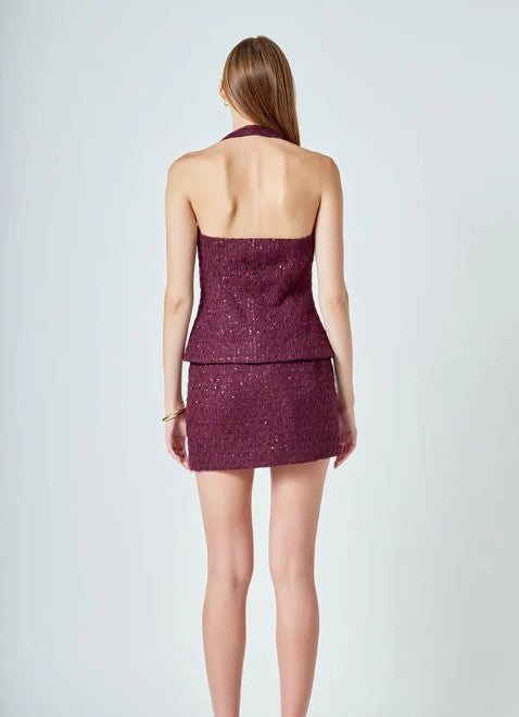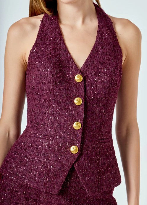 Make a statement with our SEASONED CHICNESS TWEED HALTER VEST, a modern twist on a timeless classic. Crafted from rich tweed fabric, this vest brings instant polish and sophistication to your look. The halter neckline flatters by highlighting your shoulders, while the front button closure adds both structure and style. Designed with welt pockets for a functional yet sleek finish, as practical as it is chic. Whether layered over a crisp blouse or worn solo for a bold, fashion-forward vibe, this versatile piece is perfect for elevating your day-to-night wardrobe. Pair it with the matching skirt to complete this look.