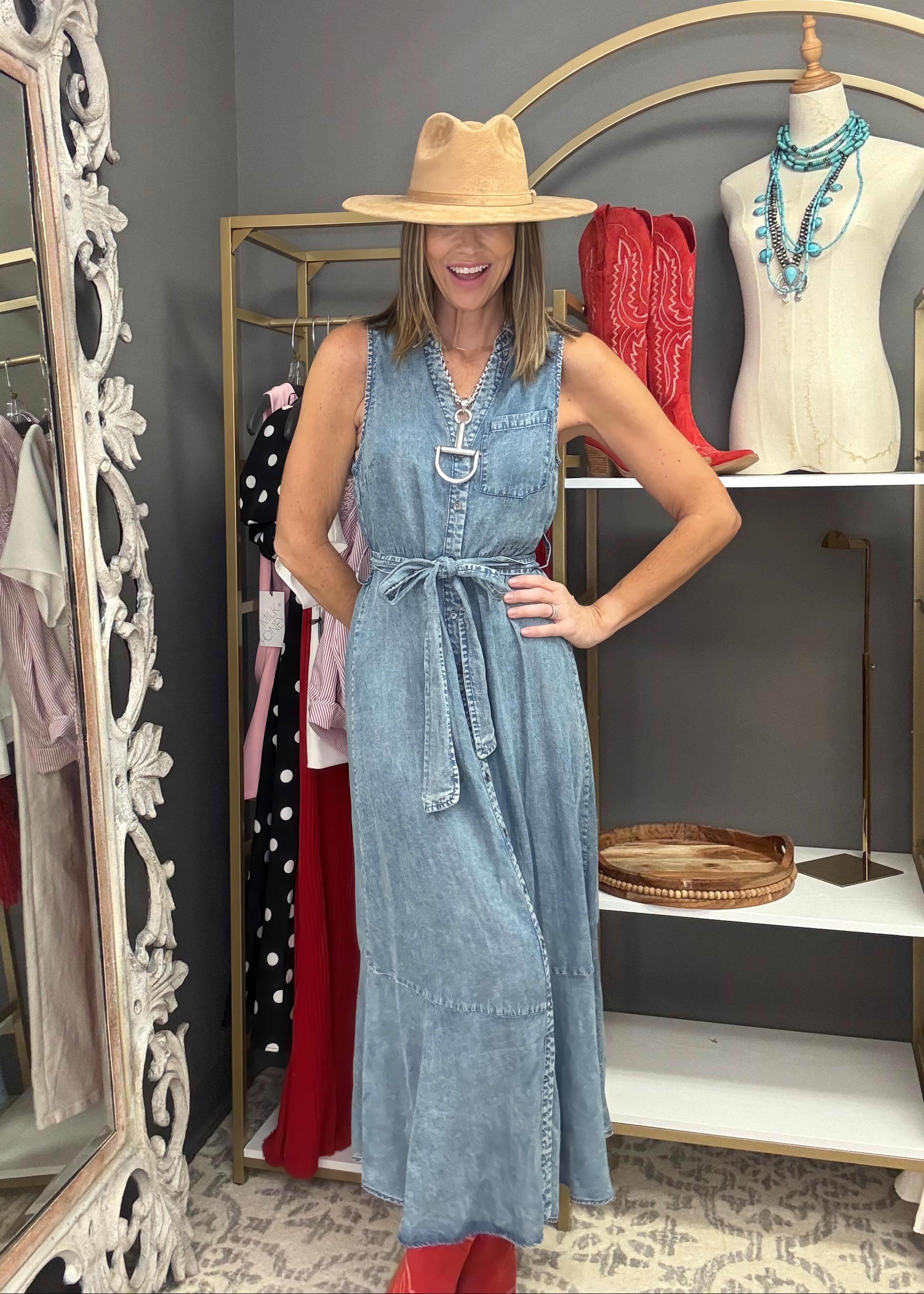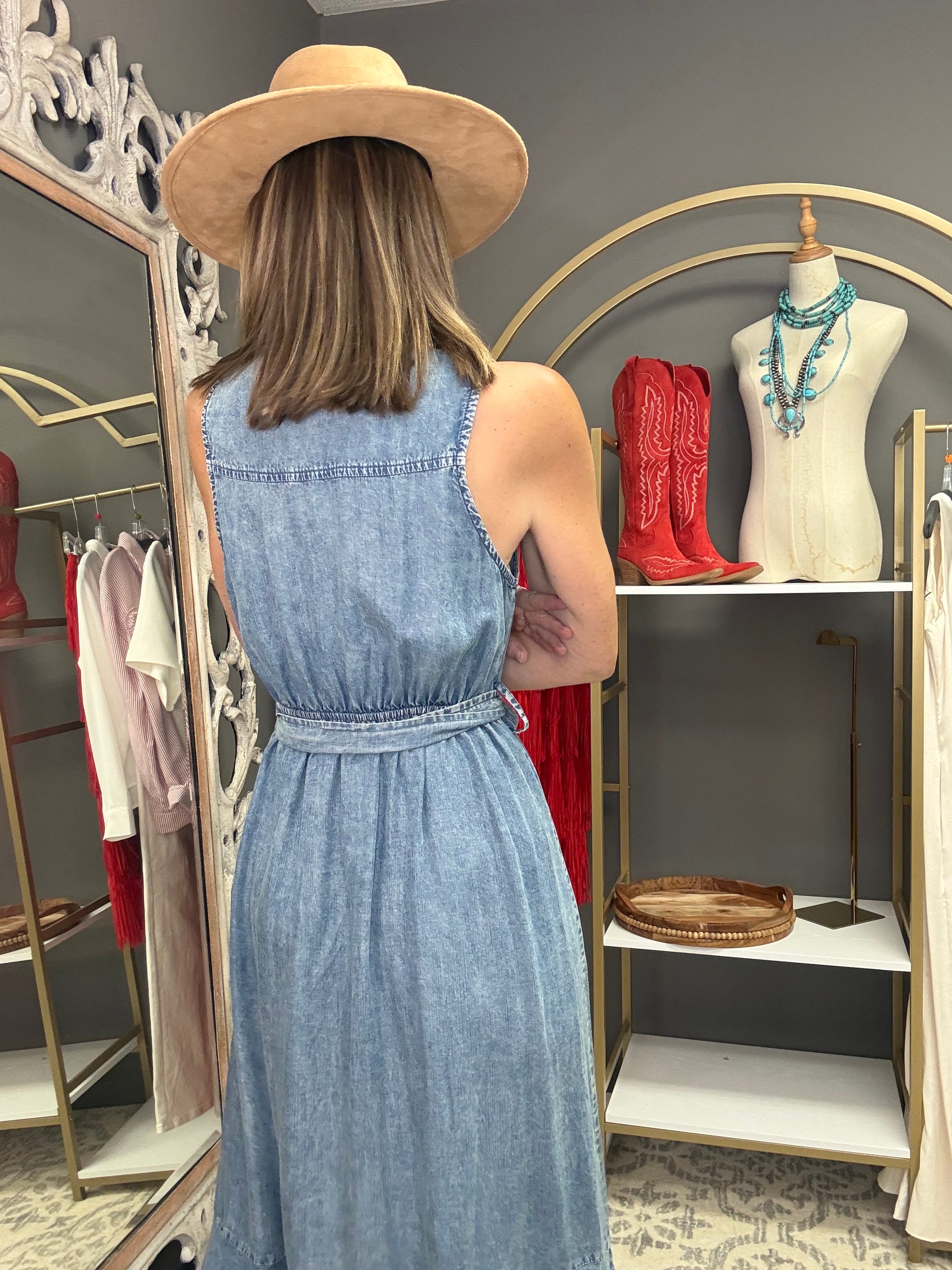 This midi dress is your ticket to looking put-together without even trying. Designed in buttery-soft TENCEL fabric that breathes beautifully, this DENIM DREAMS BUTTON FRONT TENCEL MIDI DRESS is the kind of piece you'll reach for again and again. Button up the front for a classic vibe, then tie on the removable belt to cinch your waist and show off your curves. The sleeveless silhouette paired with a crisp collar keeps things sophisticated, while a playful ruffle hem adds just enough flirtation to keep things fun. Whether you're dressing it up or keeping it casual, this dress delivers effortless elegance with a wink and a smile.