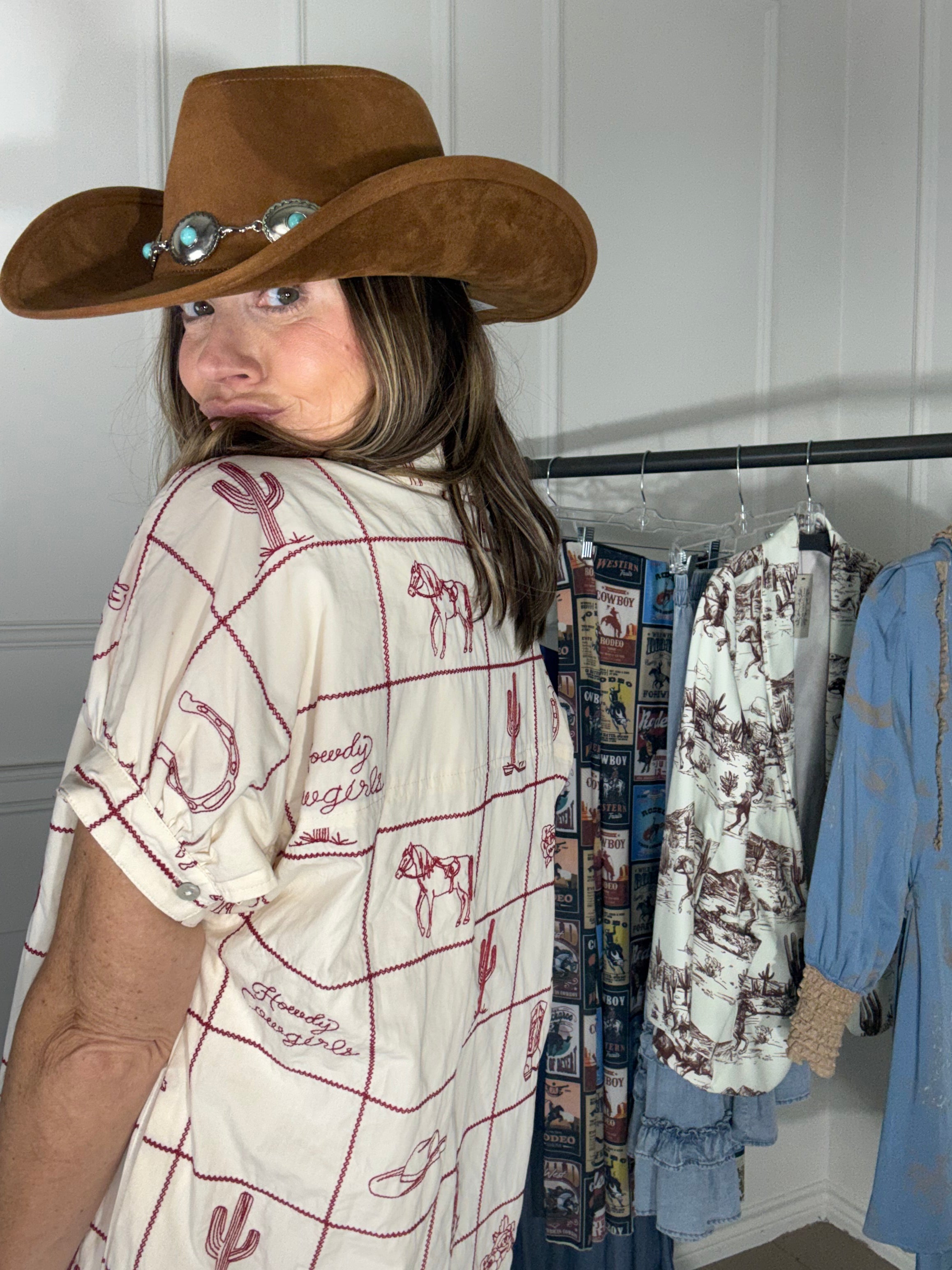 Get ready to make a statement in this cream and red cherry SOCIAL SWEETNESS WESTERN MINI SHIRT DRESS that celebrates all things western. Packed with charming rodeo illustrations—cowboy boots, desert plants, and more—arranged in a fun grid design, this cotton dress brings instant personality to any occasion. From concert venues to country outings to brunch with friends, it's the perfect pick for anyone who loves a little sass with their style.