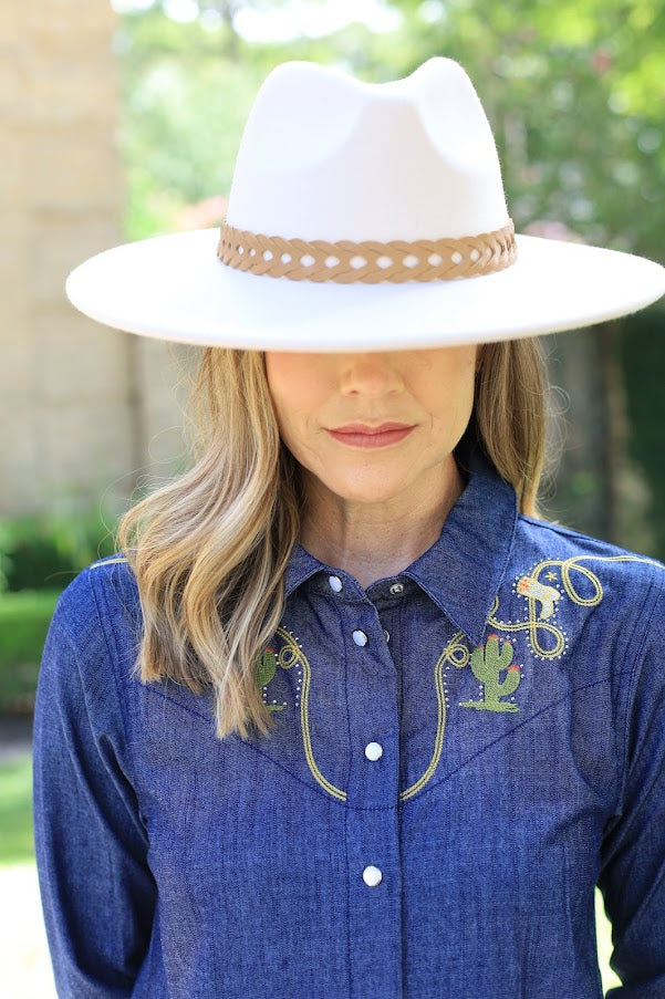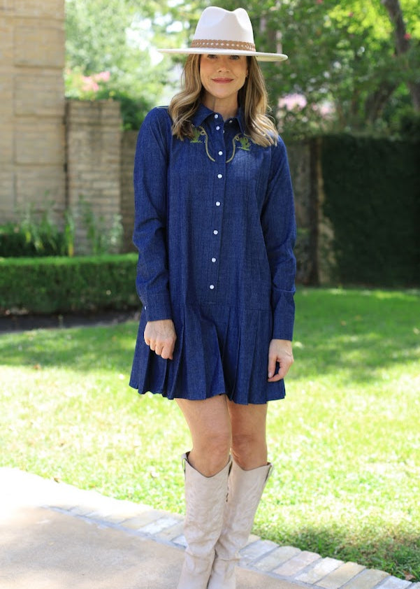 Meet the WESTERN SKIES EMBROIDERED SHIFT DRESS—a delightful denim dress with pearl snap closures, a flirty pleated skirt, long sleeves, and standout western-style embroidery that adds a fun twist.