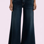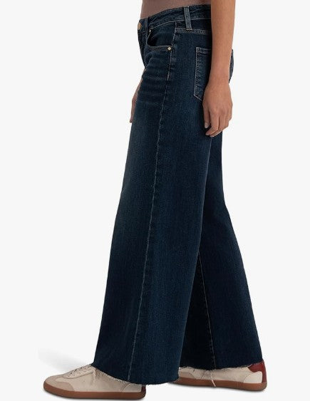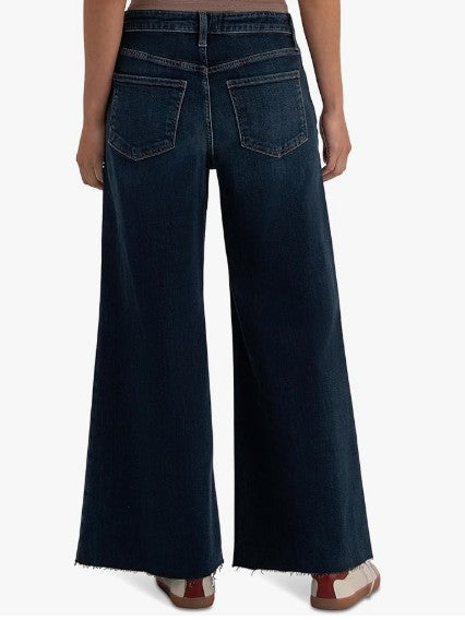 The KUT RYAN HIGH RISE SUPER WIDE LEG JEANS deliver bold style with a flattering fit. This high-rise dark denim offers a smoothing front panel with a zip-fly and one-button closure for a sleek silhouette. The super wide leg and raw hem add a modern, fashion-forward edge.