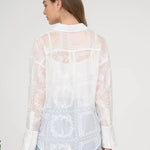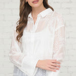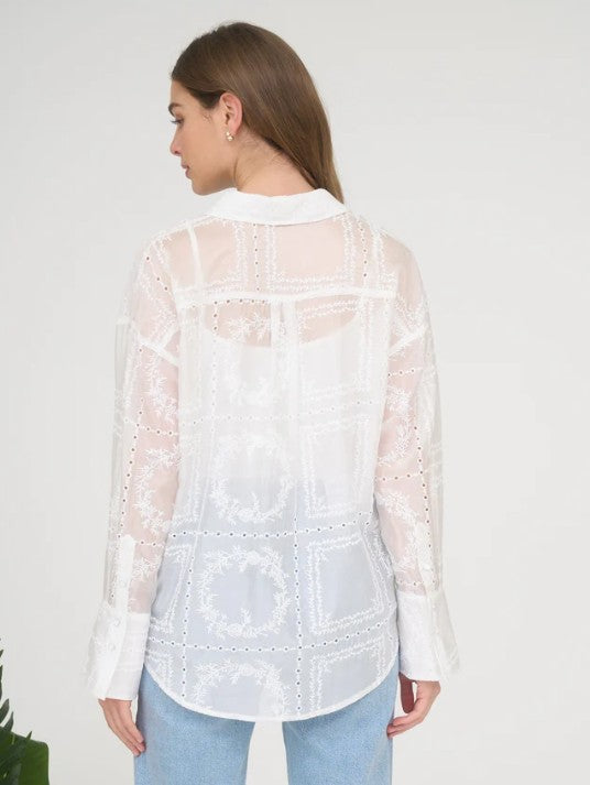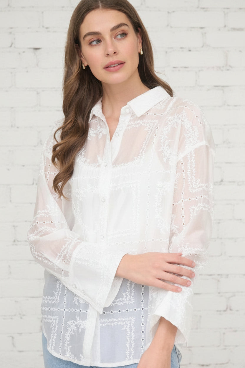 The EVERYDAY ICON EMBROIDERED BUTTON UP SHIRT brings timeless elegance to your wardrobe. This sheer blouse features delicate embroidered details throughout, creating a romantic and refined aesthetic. The lightweight fabric drapes beautifully, making it perfect for layering over basics or pairing with denim and trousers for effortless sophistication. Whether dressed up or down, this versatile piece adds an understated feminine touch to any outfit.
