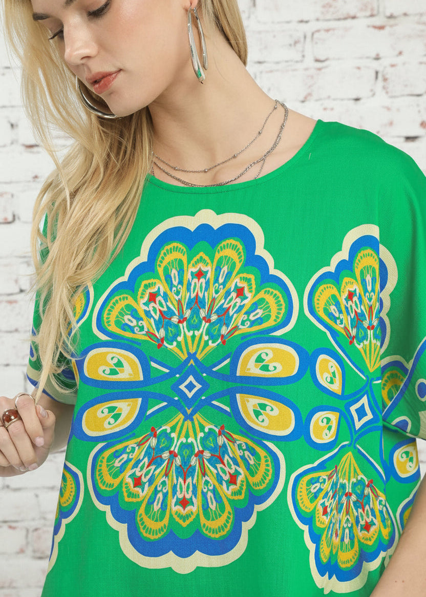 Elevate your casual wardrobe with this charming PATIO BRUNCH MIX MEDALLION PRINT BLOUSE. Featuring a relaxed rounded neckline and breezy short dolman-style sleeves, this top brings effortless style to any occasion. The vibrant green medallion print adds visual interest, while contrast trim detailing and an adjustable tie hem provide a flattering, customizable fit. Perfect for brunch outings, weekend gatherings, or layering into your everyday rotation.