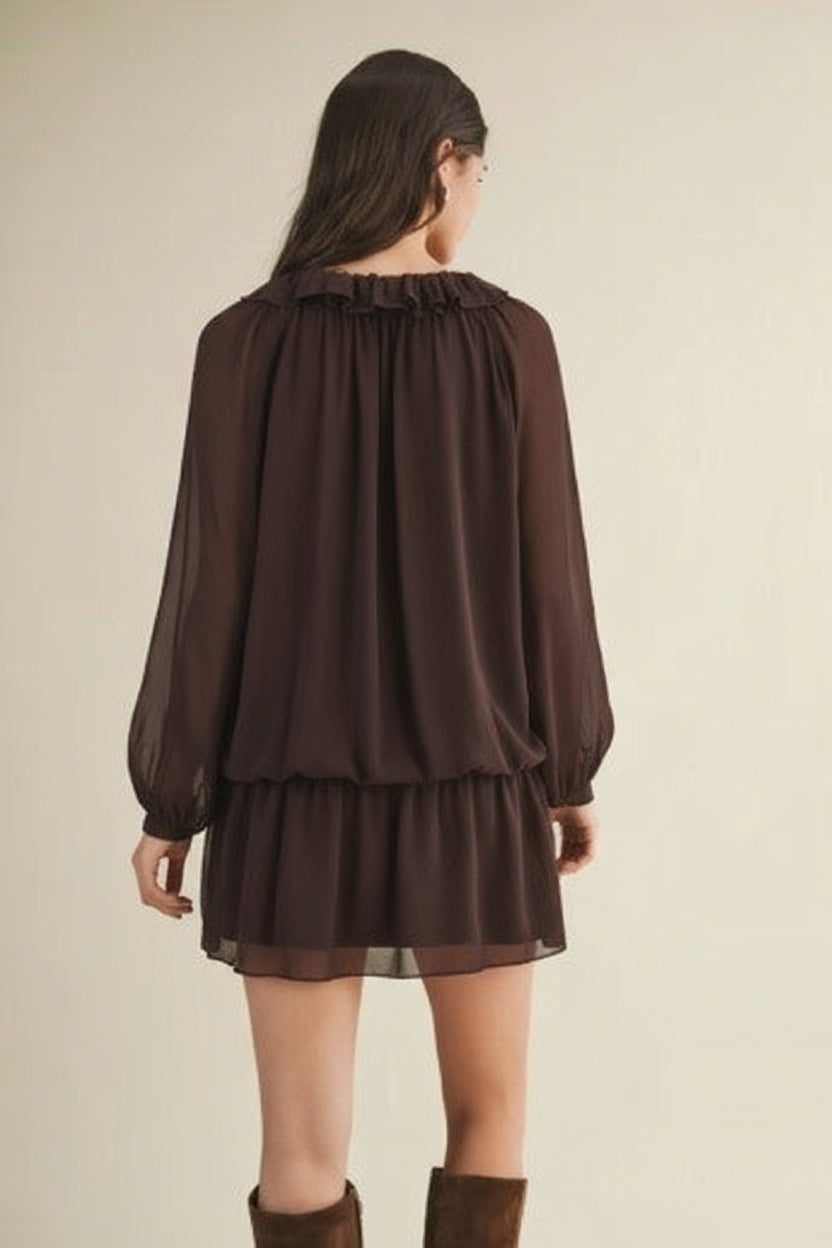 The Double Trouble Bubble Tiered Dress in chocolate features a charming ruffle neckline with a tie, long sleeves, and a flattering drop bubble waist. Its playful bubble hemline adds a stylish, fun touch that makes this dress a standout choice for any occasion.