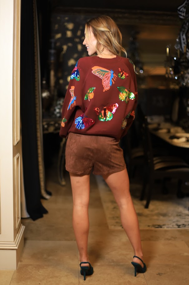 Embrace vibrant elegance with the QUEEN OF SPARKLES SEQUIN BUTTERFLY CARDIGAN! This rich burgundy knit is adorned with an array of dazzling, multicolored sequin butterflies, each intricately detailed to create a lively, whimsical look. Featuring a flattering V-neckline, button-down front, and relaxed fit, this cardigan blends cozy comfort with bold statement style. Perfect for adding a pop of sparkle to your fall wardrobe, it pairs beautifully with skirts, denim, or layered over dresses for a chic, eye-catching ensemble.