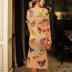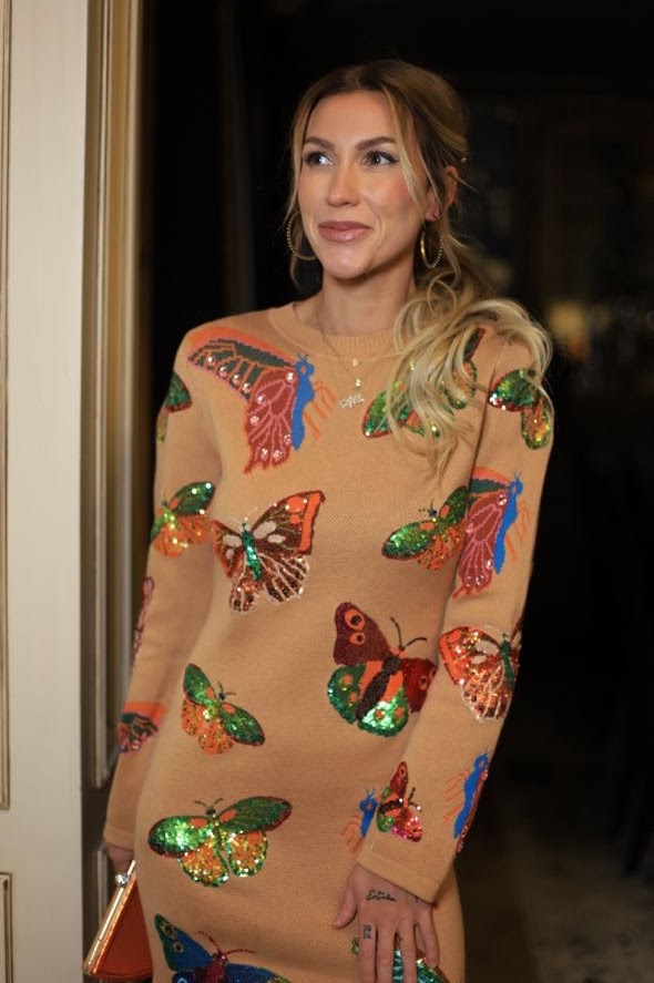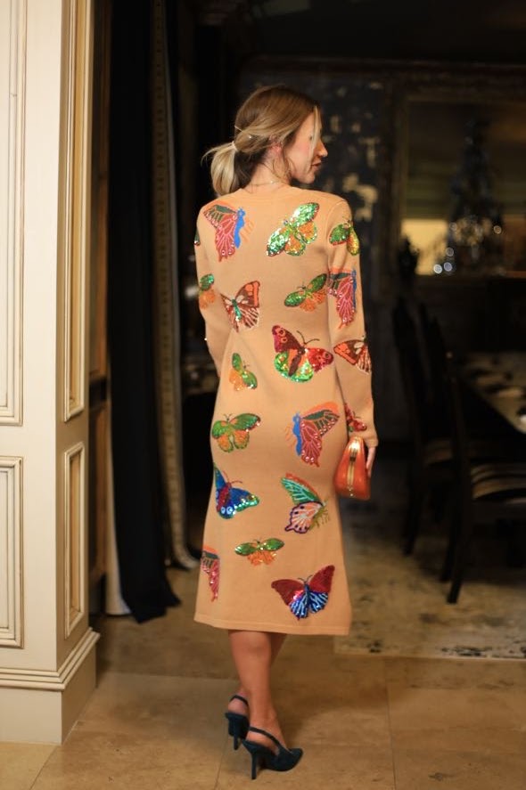 Make a dazzling statement with the QUEEN OF SPARKLES SEQUIN BUTTERFLY DRESS! This chic camel-toned knit sweater midi is adorned with vibrant, multi-colored sequin butterflies that shimmer with every step. Featuring a flattering crew neckline, long sleeves, and a figure-skimming silhouette, it blends cozy comfort with eye-catching glamour. Perfect for brunch, parties, or seasonal celebrations, this dress effortlessly combines whimsical charm with sophisticated sparkle—just add heels or boots for a complete head-turning look.
